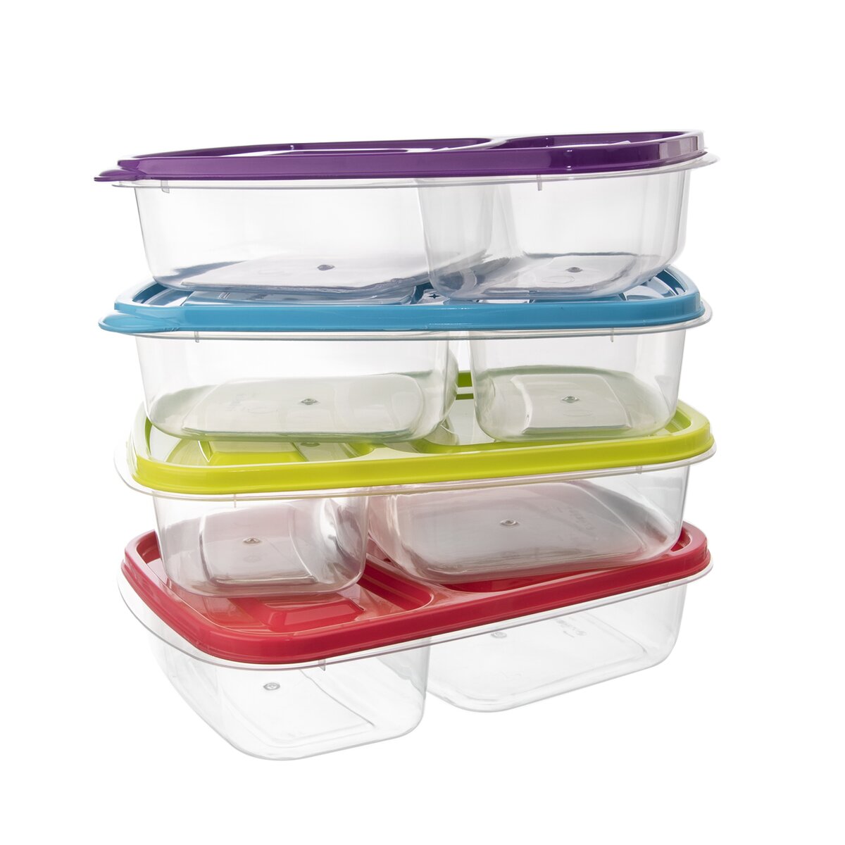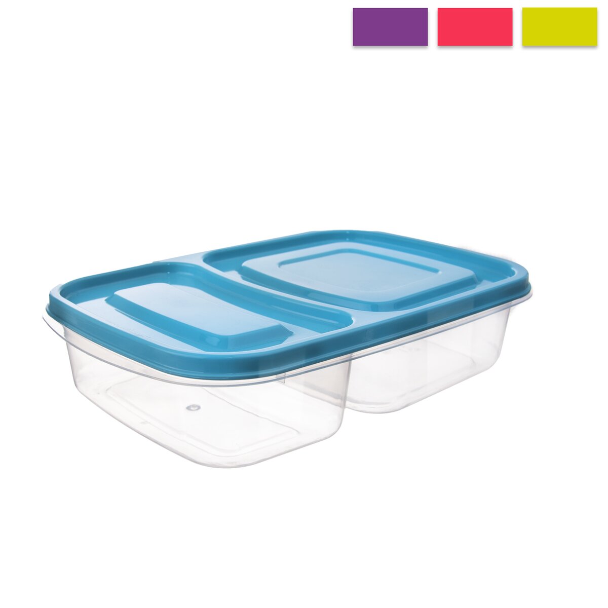Dóza s viečkom delená na dve sekcie skvelo uchová potraviny v chladničke i mrazničke (do -25 °C), sú skvelé na prenášanie potravín, ide v nich ohrievať jedlo v MVT (do +95 °C), môžete ich použiť do umývačky na riad. Farebný assort viečok. Materiál: plast. Rozmery: objem 1,2 l, 24x16x5 cm.