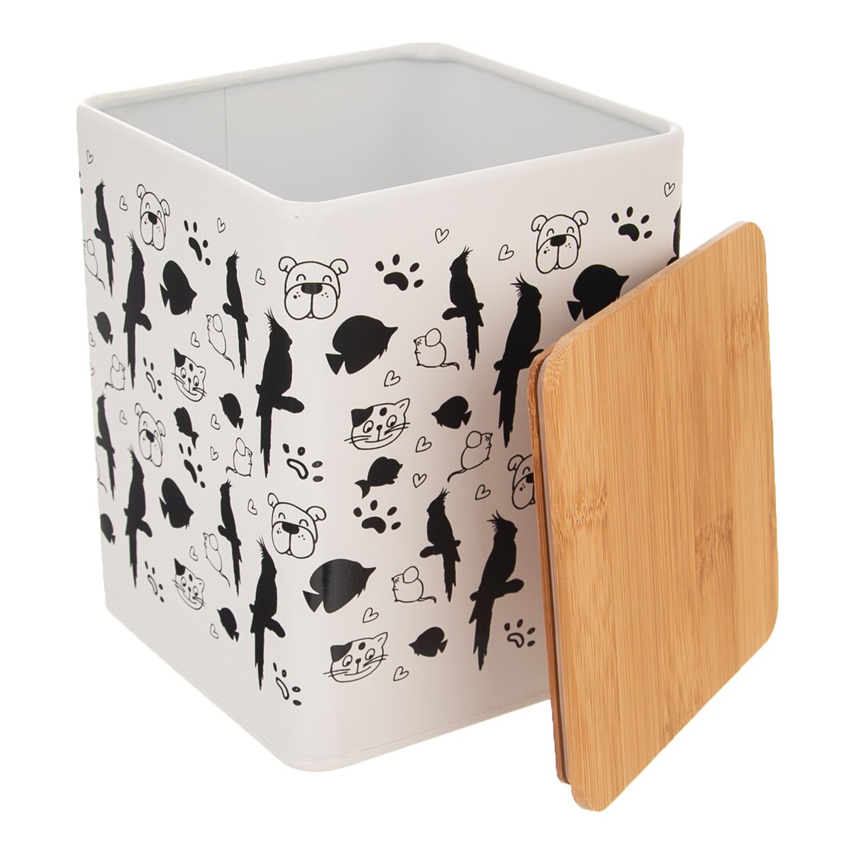 Kód produktu 127532Hranatá plechová dóza v rozmere 11,5x11,5x14 cm, so zaujímavou potlačou a s viečkom. Vhodná na uloženie maškŕt alebo sušienok pre domácich miláčikov.