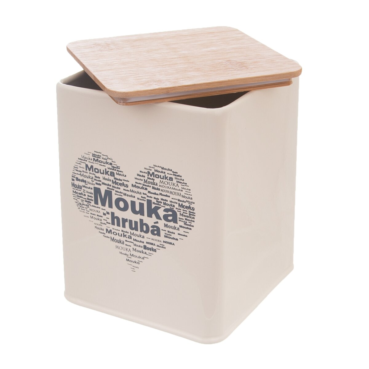 Kód produktu 153698Hranatá plechová dóza s dizajnovým nápisom HRUBÁ MOUKA v tvare srdca, uzavretá bambusovým viečkom. Nielen praktický, ale aj dizajnový kúsok.