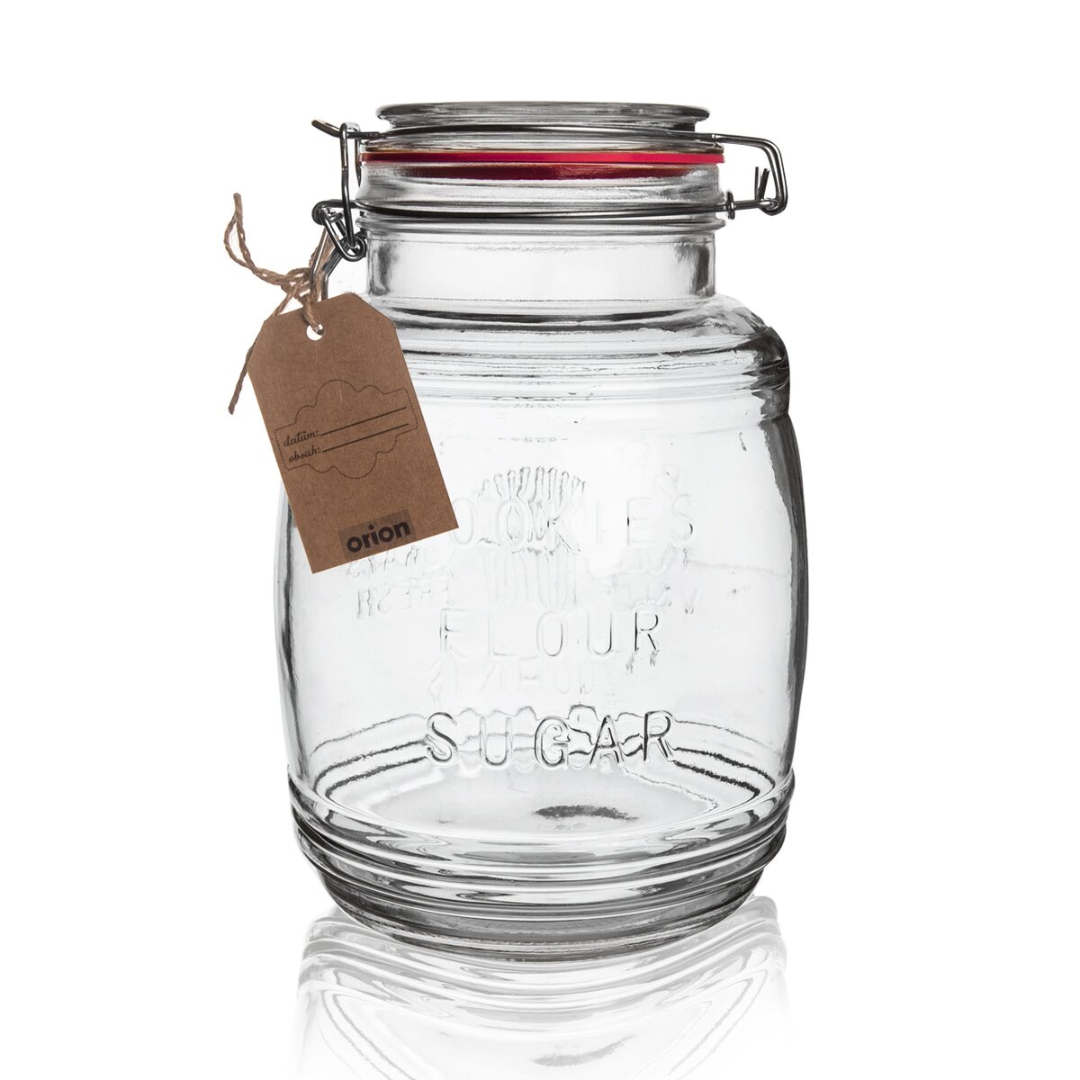Sklenená dóza s drôteným patentovým uzáverom a so silikónovým tesnením. Tvar súdku. Rozmery: objem 1,8 l, pr. 13 cm, v. 20 cm.