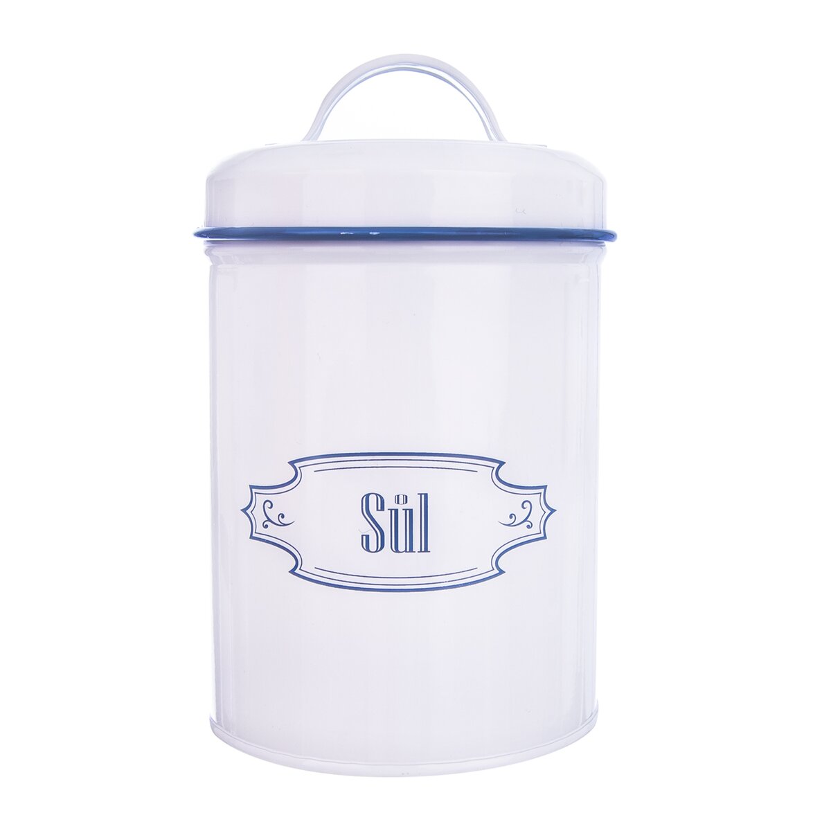 Kód produktu 153661Dóza s viečkom na uloženie soli. Materiál: plech, Rozmery: pr. 11 cm, v. 18,5 cm.