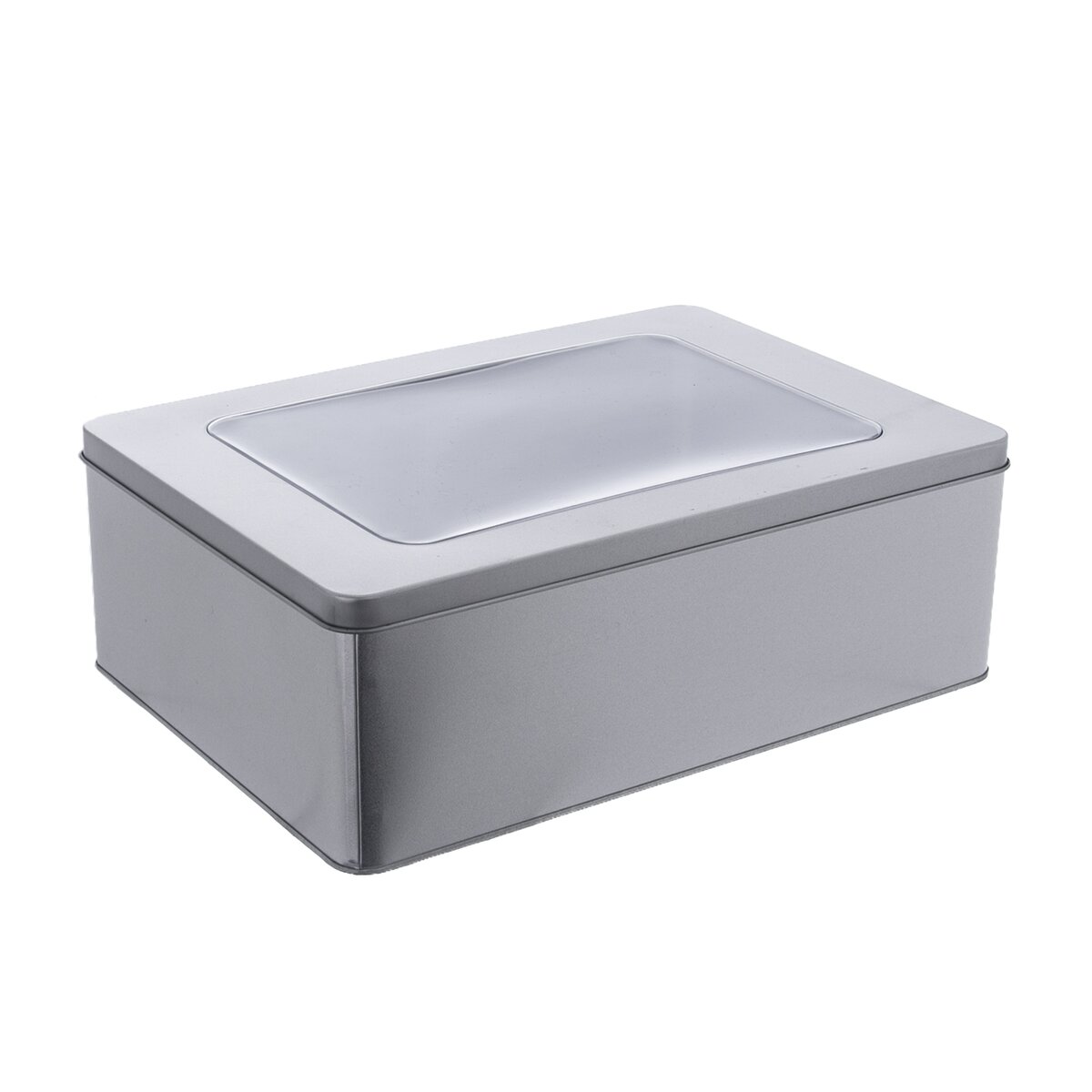 Kód produktu 153659Dóza s viečkom. Skvelá ako darček naplnená vašimi vlastnými cukrovinkami. Priehľadné okienko vo viečku. Materiál: kov, plast. Rozmery: 27x19x9 cm.