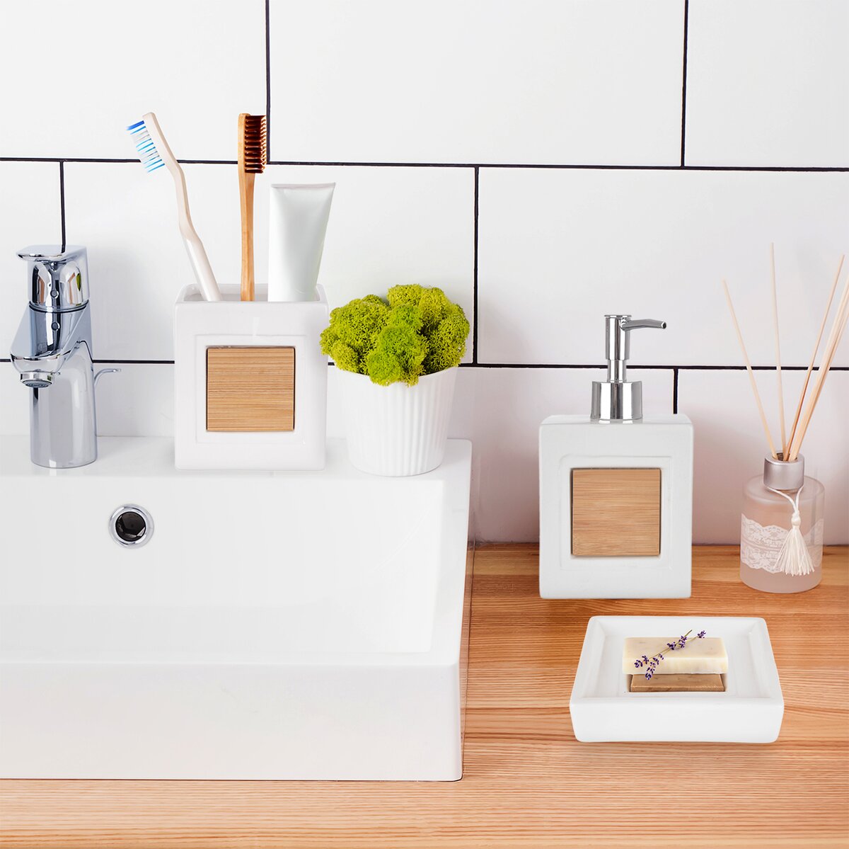 Elegantný biely dávkovač na tuhé mydlo je vyrobený z tvrdého dolomitu a je doplnený bambusovým drevom. Kombinácia bielej farby a teplého odtieňa dreva zútulní mnohokrát studený priestor kúpeľne, je nadčasový a moderný.