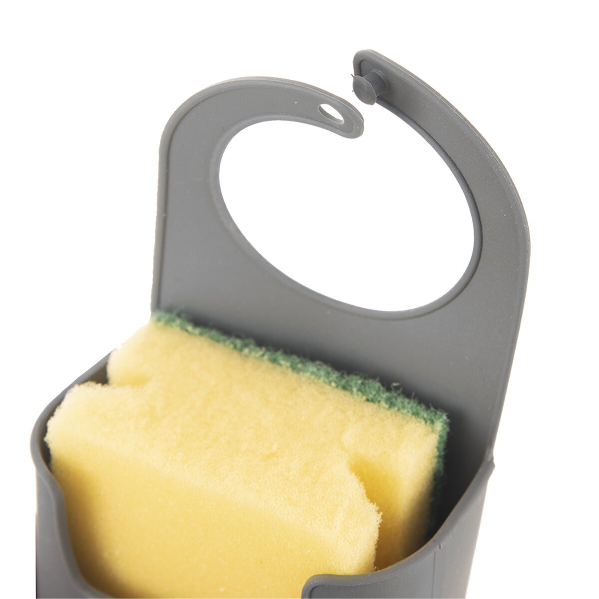 Šedý držiak z TPE plastu s otvormi v spodnej časti a rozopínacím závesom je možné pripevniť za vodovodnú batériu. Vo vnútri vložená hubka z polyuretánu je súčasťou balenia.