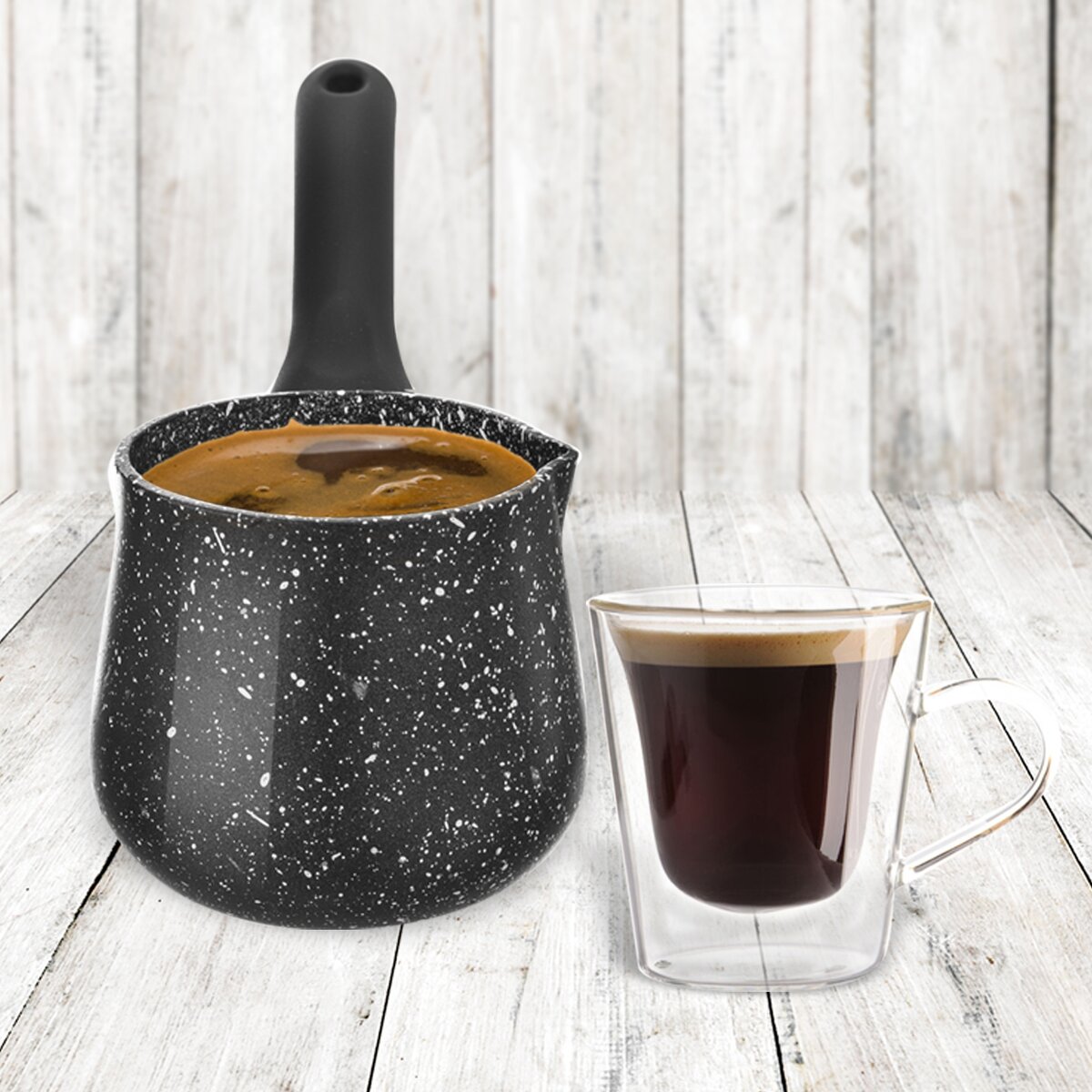 Kód produktu 123433Džezva GRANDE s objemom 0,35 l s nepriľnavým povrchom a plastovou rukoväťou na prípravu kávy.