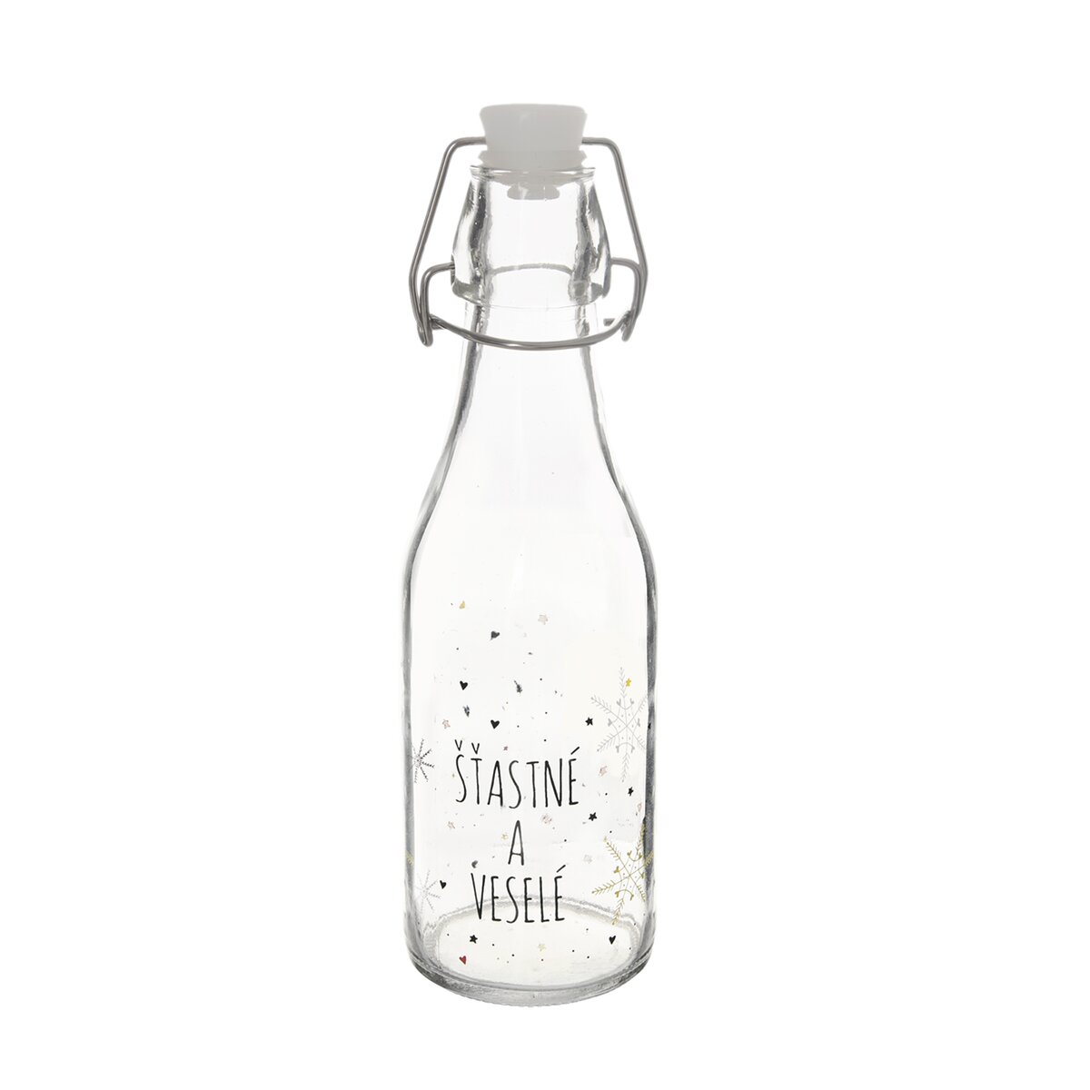 Kód produktu 152375Okrúhla sklenená fľaša VLOČKA s objemom 0,52 l má pákový uzáver a silikónové tesnenie. Zdobí ju dekor bielych a zlatých vločiek a nápis ŠŤASTNÉ A VESELÉ. Je ideálna na uloženie nápojov typu vaječný koňak, punč, slivovica alebo domáceho sirupu.