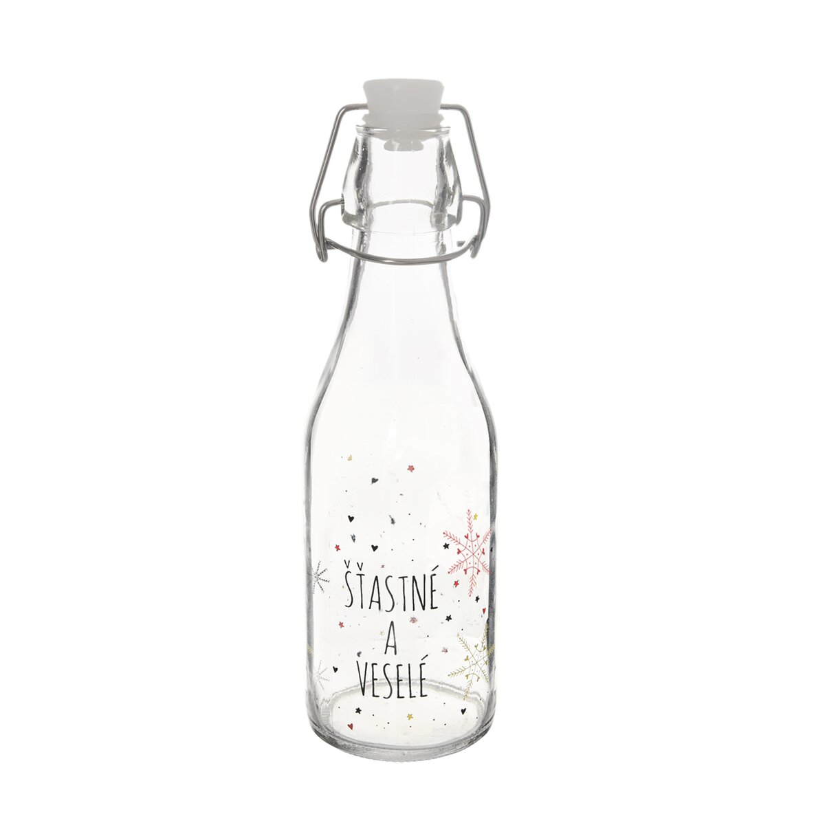 Kód produktu 152376Okrúhla sklenená fľaša VLOČKA s objemom 0,52 l má pákový uzáver a silikónové tesnenie. Zdobí ju dekor červených a čiernych vločiek a nápis ŠŤASTNÉ A VESELÉ. Je ideálna na uloženie nápojov typu vaječný koňak, punč, slivovica alebo domáceho sirupu.