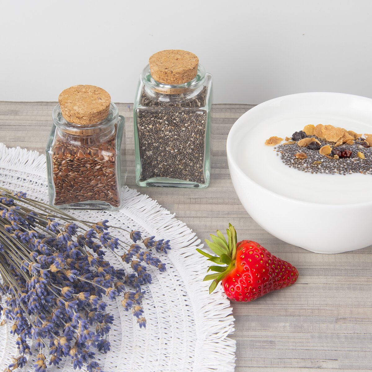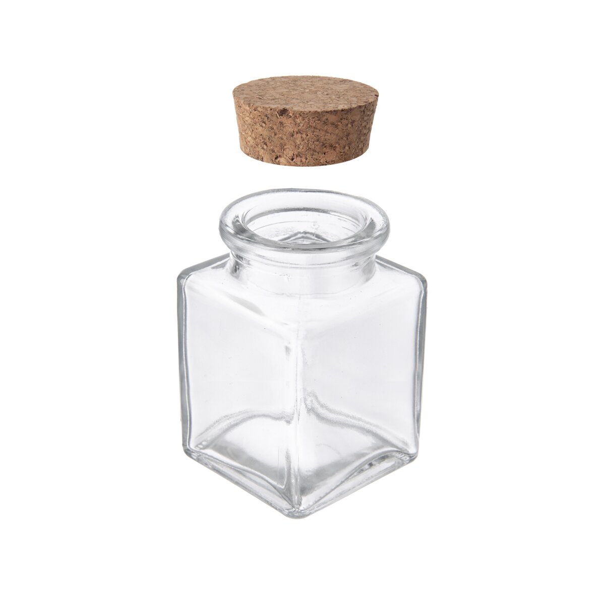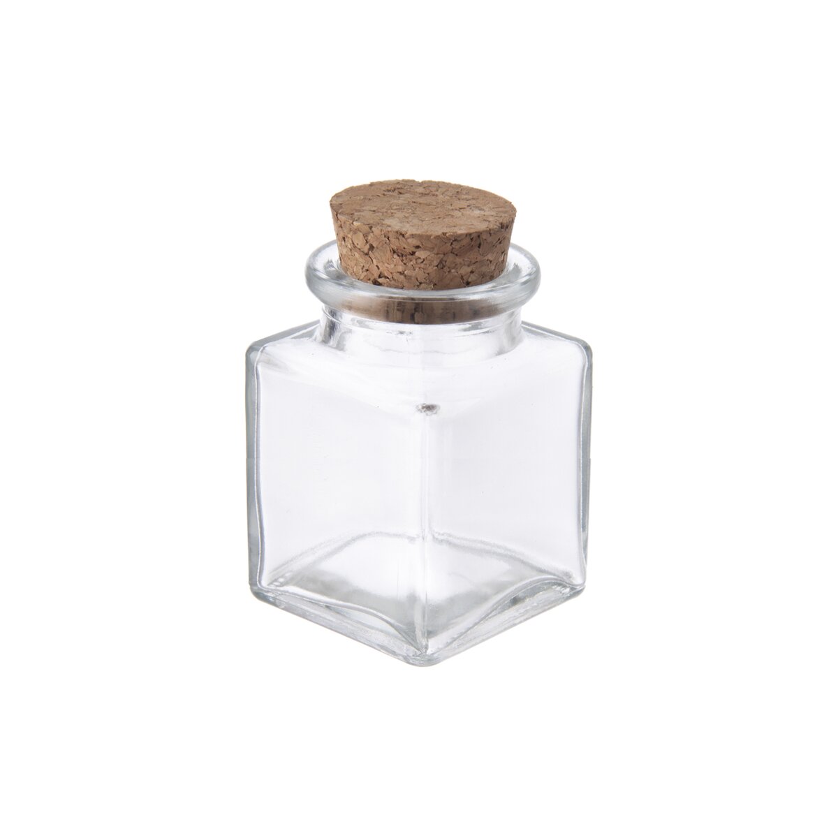 Kód produktu 143796Hranatá sklenená fľaša s objemom 80 ml s korkovou zátkou je určená na uloženie korenia, semienok, sušených byliniek, kúpeľovej soli a ďalších drobností.