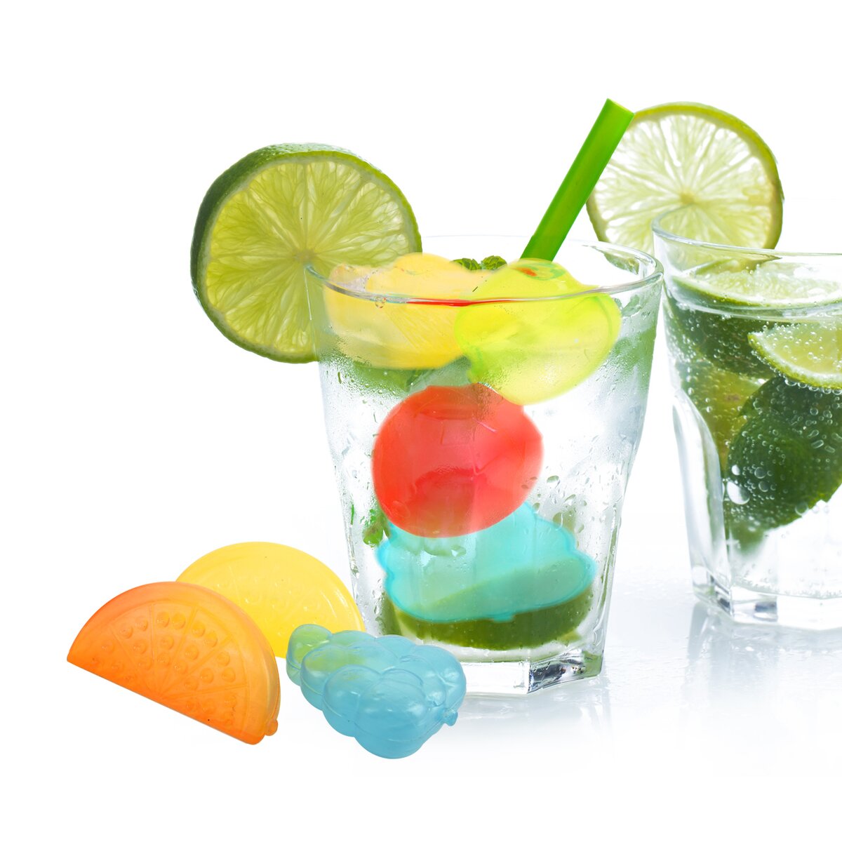 Kód produktu 151113Sada dvadsiatich ľadových kociek z plastu v tvare ovocia. Každá má rozmer cca 2,5 x 2,5 cm. Slúži na ochladenie nápoja, ktorý však nezriedi rozpustenou vodou.