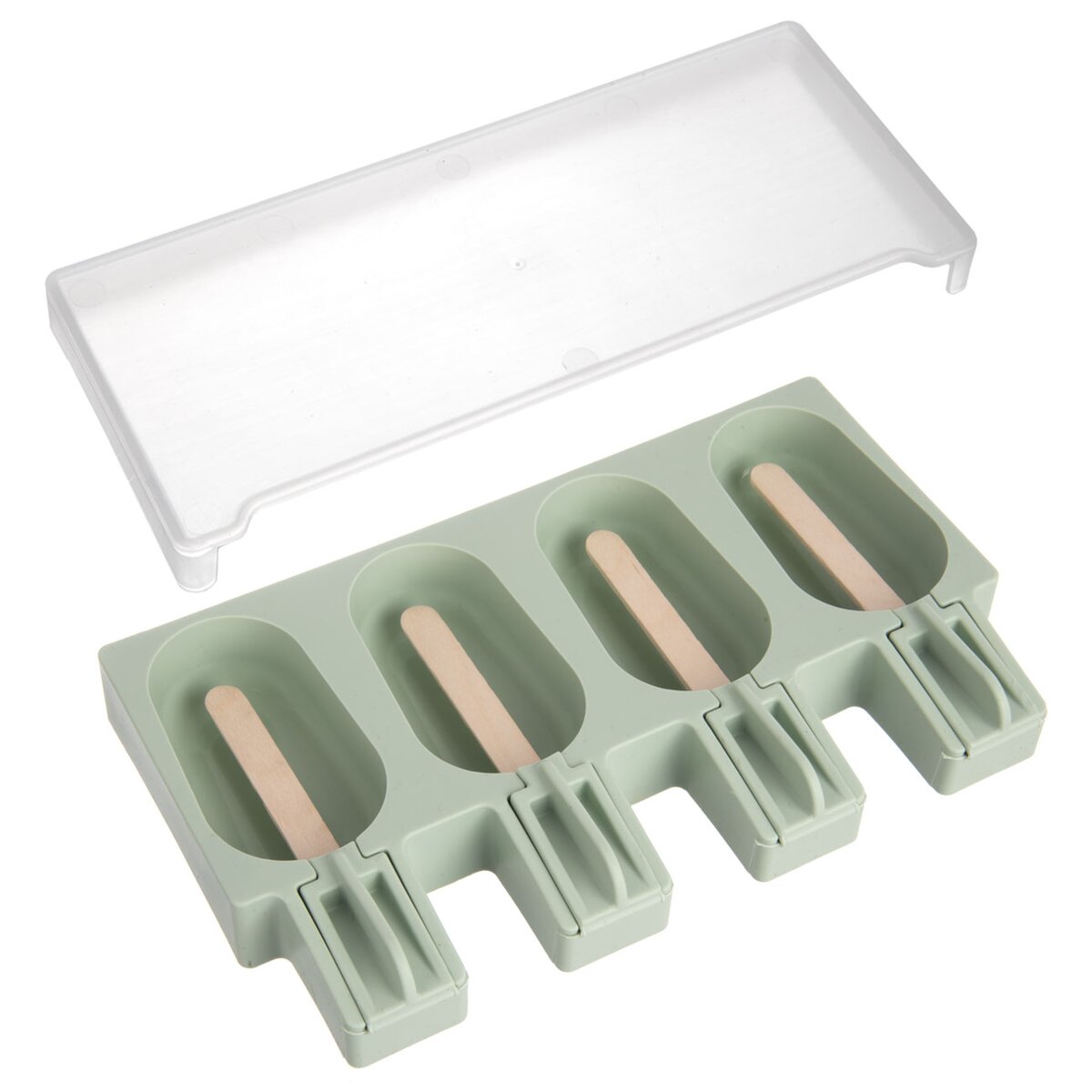 Kód produktu 154409Zelená silikónová forma so 4 priehlbinami a 24 kusmi drevených tyčiek slúži na výrobu osviežujúcich domácich nanukov i nepečených dezertov poliatych čokoládou alebo inou polevou.