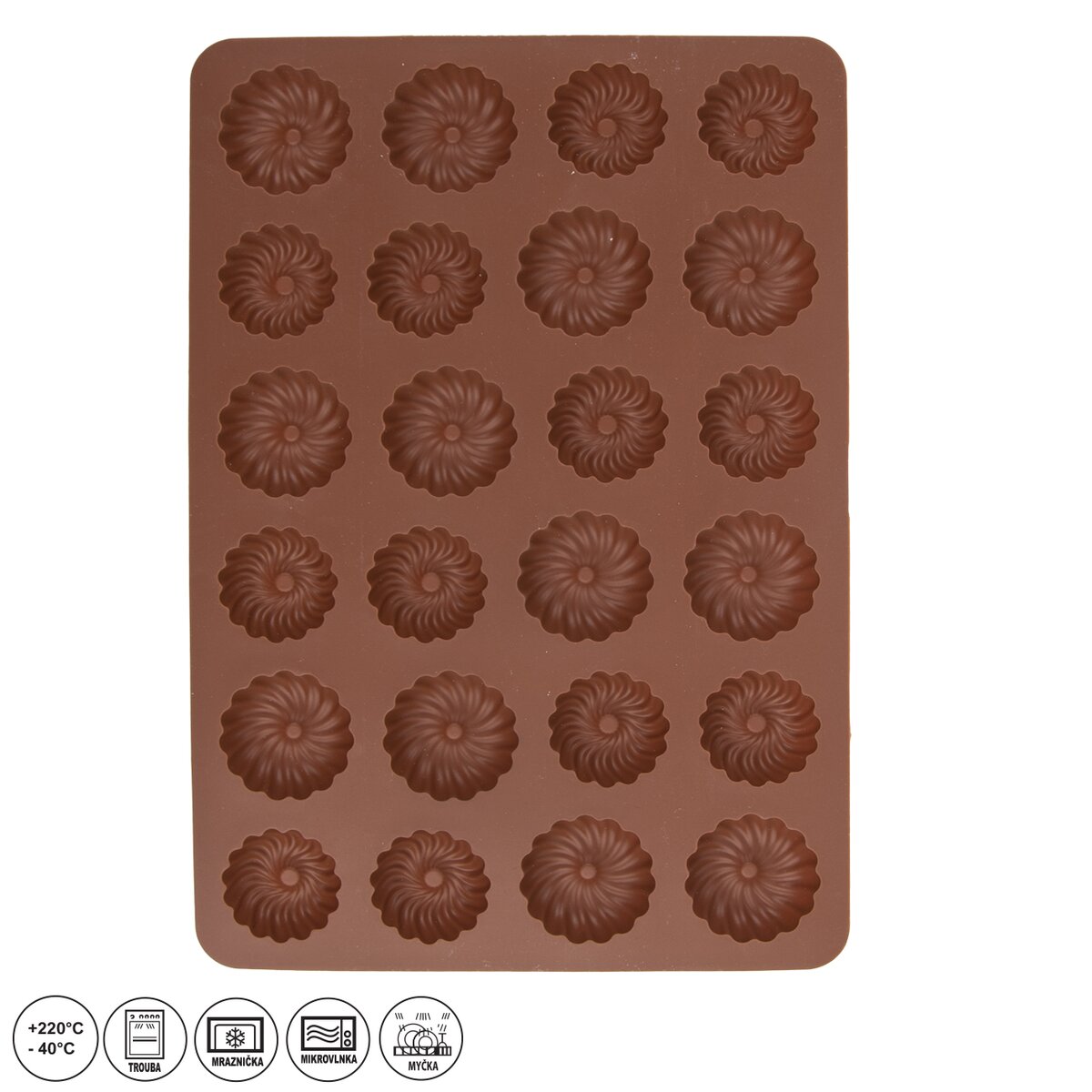 Silikónová forma na košíčky na pečenie 2 veľkostí košíčkov – celkom 24 ks. Rozmer (dxšxv): 32x22x1,5 cm, rozmer košiku 4,3x4,3 cm.Silikónové formy sú ľahké a nepriľnavé, cesto sa v nich nepripeká, nepreberajú pachy z potravín. Odolné teplotám od -40 °C do+220 °C. Ľahké umývanie aj v umývačke, sú veľmi skladné.