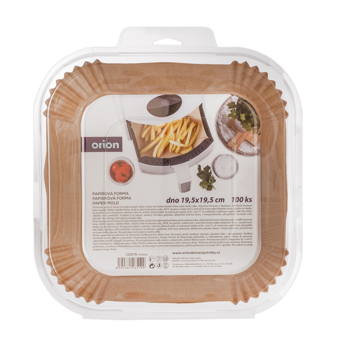 Kód produktu 120078Štvorcová papierová forma do teplovzdušnej fritézy chráni kôš teplovzdušnej fritézy pred zvyškami jedla, olejovými škvrnami a škrabancami. Predĺži životnosť koša, uľahčí čistenie a údržbu fritézy. Hodí sa tiež do klasickej rúry, MVR, do panvice, koláčových a tortových foriem zodpovedajúceho tvaru , na grilovaciu dosku, do parného hrnca. Na prípravu koláčov, zeleniny, cestovín, diétnych jedál. Je určená pre teploty až do +220 °C. Je vodotesná, nepriľnavá, neprepúšťa olej, ľahká, skladná, veľmi praktická. Využijete ju na pečenie, vyprážanie, fritovanie, grilovanie, skladovanie pokrmov doma, v kempe/karavane, pri grilovaní na terase alebo záhrade. Neovplyvňuje chuť pripravovaného jedla. Sada 100 ks. Materiál: silikónový olejový papier (vyrobený z drevenej buničiny a silikónového oleja). Rozmery: 24,5x24,5x4,5 cm, dno 19,5x19,5 cm.