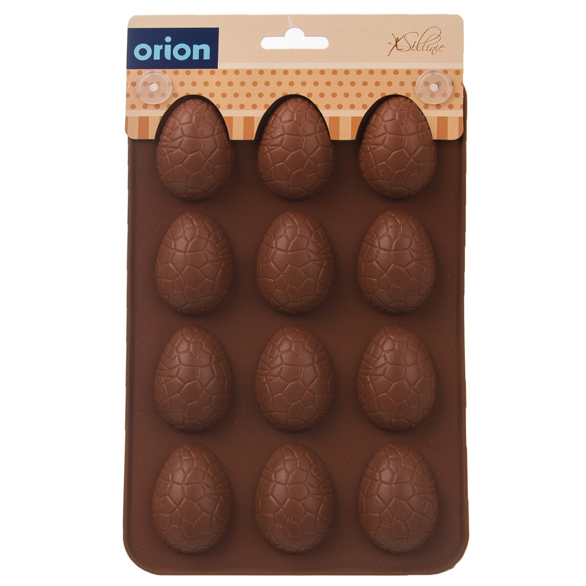 Kód produktu 151765Nepriľnavá hnedá veľkonočná silikónová forma pre rýchle a rovnomerné pečenie 12 ks sušienok v tvare vajíčka alebo na výrobu originálnej čokolády.