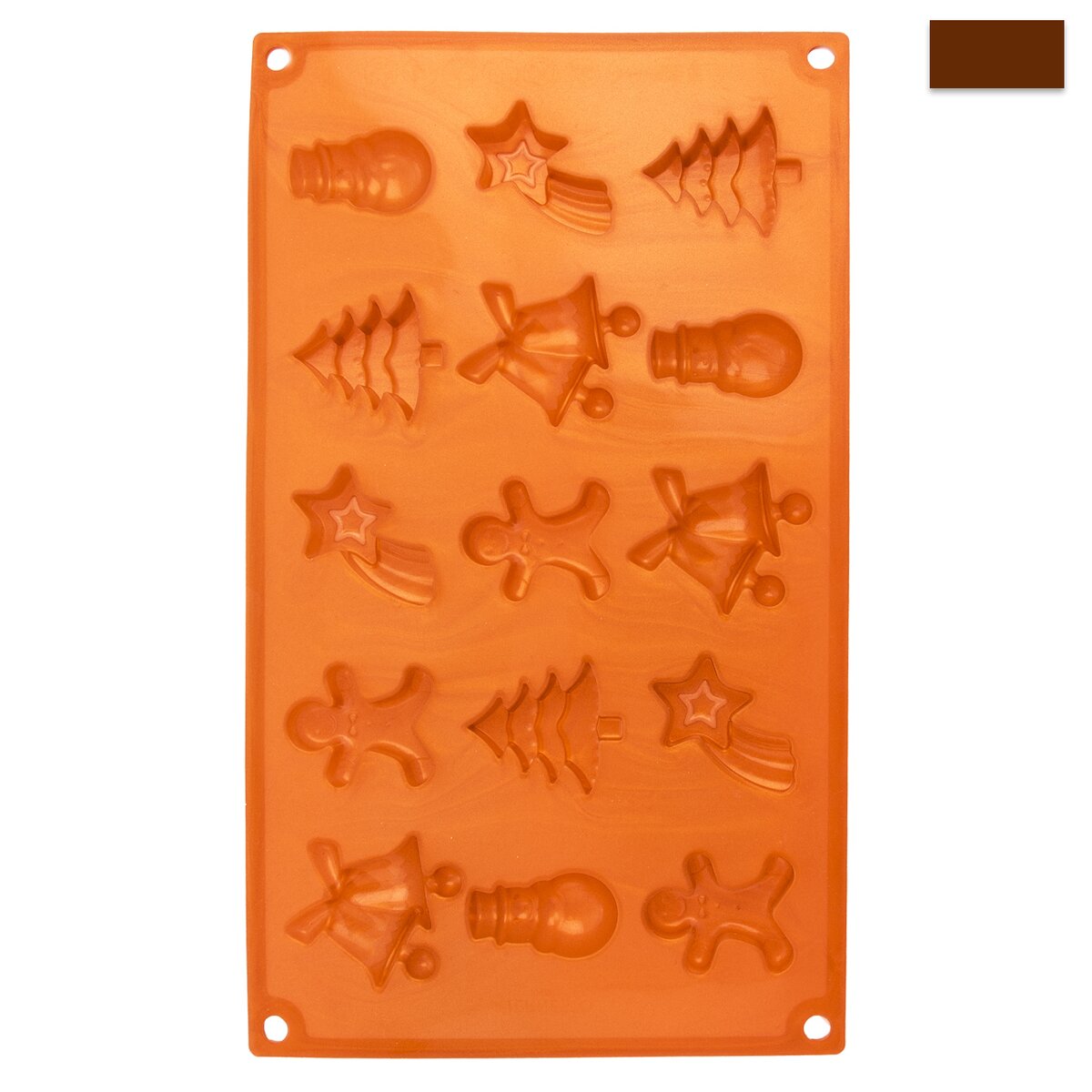 Kód produktu 120051Silikónová forma Vám vytrvorí dobroty z čokolády vo vianočných tvaroch – stromček, kométa, zvončeky, panáčik, snehuliak. Materiál: silikón. 15 foriem. Znáša vysoké teploty (od -40 °C do +220 °C), neprenáša chute ani vône z použitých potravín. Vhodná do umývačky riadu. Môžete využiť tiež ako formu na ľad. Rozmery: 29x17x1,5 cm, tvary cca 4,5x3 cm.