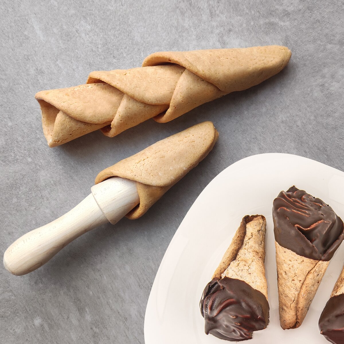 Kód produktu 121034Drevený kužeľ s rukoväťou je určený na stáčanie kornútkov na zmrzlinu, medových kornútkov s jahodovou penou aj slaných kornútkov s rôznymi náplňami. Je vyrobený z bukového dreva.