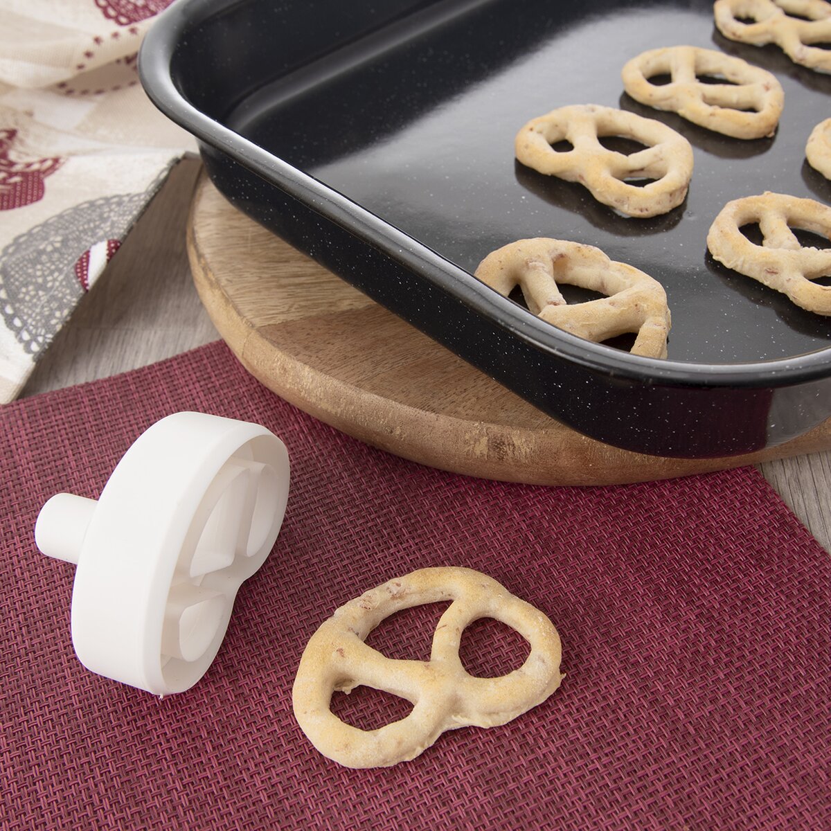 Napr. zo syrového, maslového cesta stačí vyvaľkať plát o šírke cca 5 mm a formičkou vykrajovať jednotlivé tvary. Stlačením piestu tvar vytlačíme do dlane a položíme na plech.