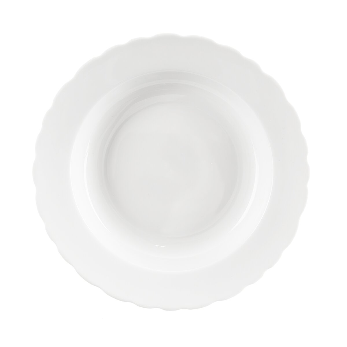Kód produktu 129557Hlboký porcelánový tanier okrúhleho tvaru má priemer 24 cm a je zdobený decentným vlnitým okrajom.