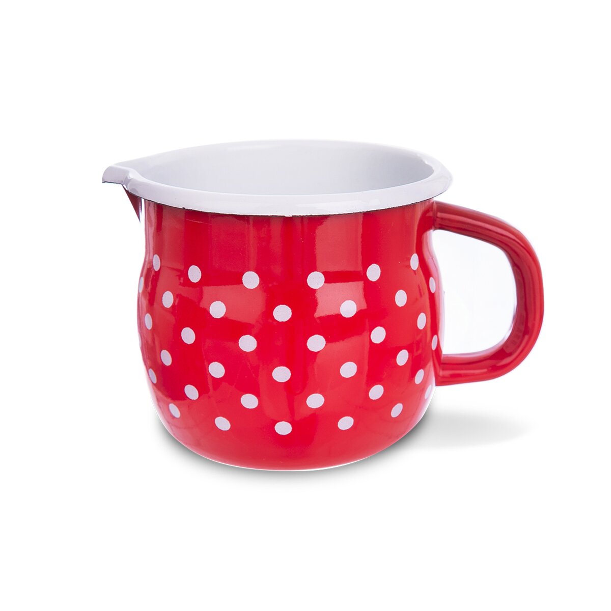 Kód produktu 113136Červený baňatý smaltovaný hrnček s objemom 0,8 l a bielymi bodkami.