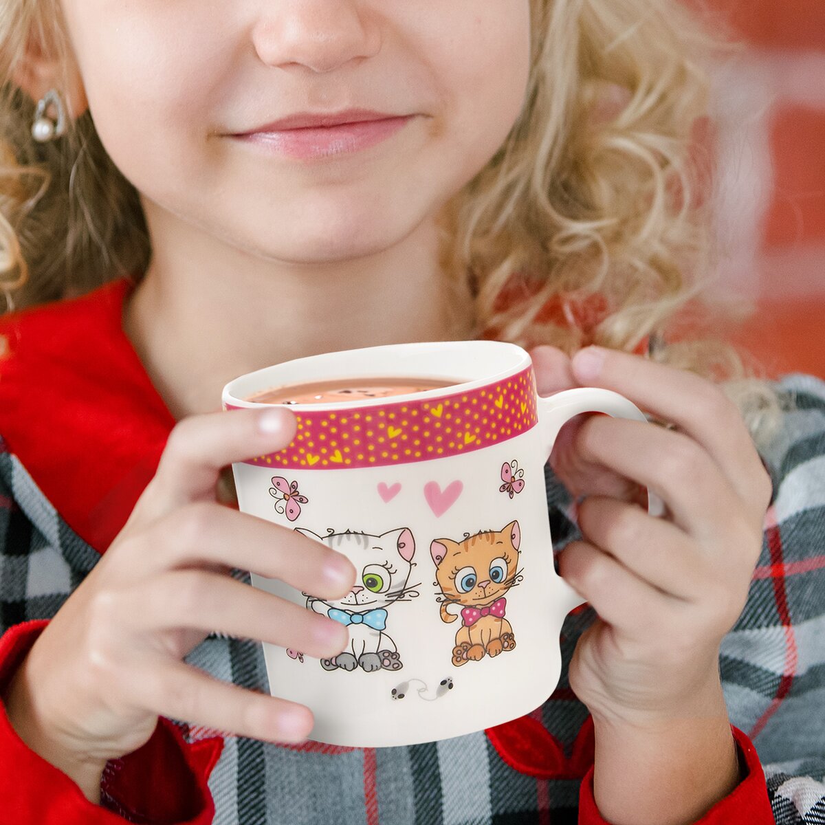Menší porcelánový hrnček s pekným dekorom dvoch roztomilých kocúrikov s mašľou je ako stvorený na dopĺňanie tekutín pre deti od 3 rokov. Malí nezbedi si z neho vychutnajú sladučké kakao, čaj, ochutené mlieko i domácu šťavu.