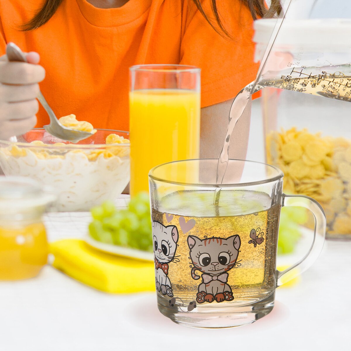 Hodí sa na podávanie čaju, kakaa, obľúbenej čokolády i studenej domácej šťavy alebo malinovky. Motív kocúrikov sa objavuje aj na ďalšom detskom riade, príboroch, termoskách aj prestieraní z kolekcie Kocúry.