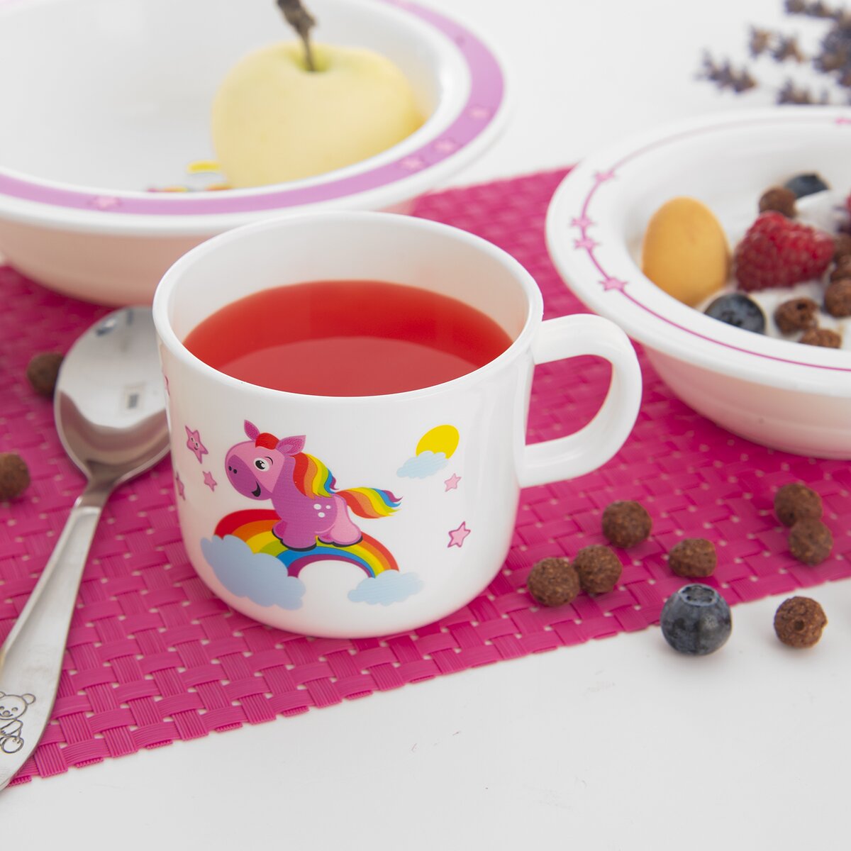 Hrnček s rozprávkovým koníkom, ktorý vykúzli úsmev na tvári každého dieťaťa. Má objem 250 ml, vaše malé ratolesti z neho tak môžu piť džús, čaj, mlieko aj kakao.