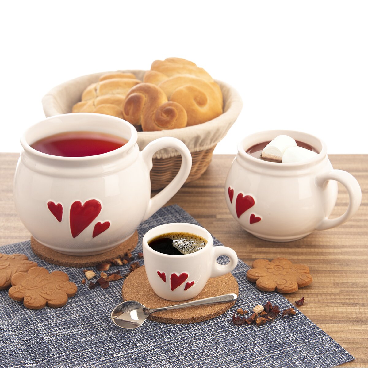 Viac informáciíVoňavý čaj, horúce kakao alebo naozaj veľkú kávu s mliekom si vychutnáte v romanticky ladenom hrnčeku z keramiky - kameniny. Trojica červených sŕdc na bielom podklade priamo nabáda k tomu, urobiť si raňajky do postele alebo sa zababušiť do deky a vychutnať si svoj obľúbený nápoj, napríklad s partnerom pri sledovaní seriálu.