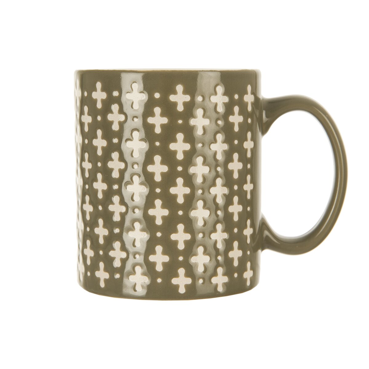 Kód produktu 129615Keramický hrnček s objemom 0,35 l s motívom krížov a glazúrou v tlmenej zelenej farbe.