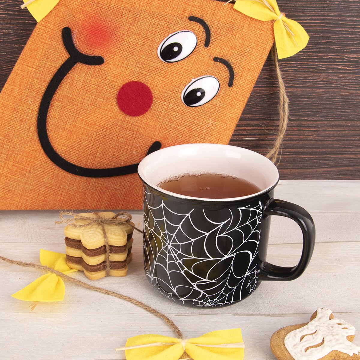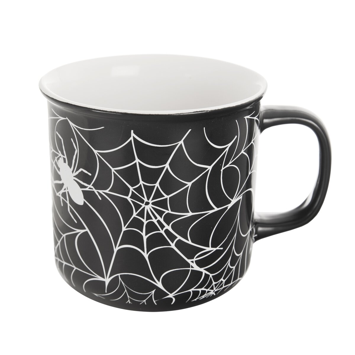 Kód produktu 129473Keramický hrnček s objemom 0,46 l, s tmavou glazúrou a motívom pavučín, je určený na podávanie čaju, kakaa a iných teplých či studených nápojov.