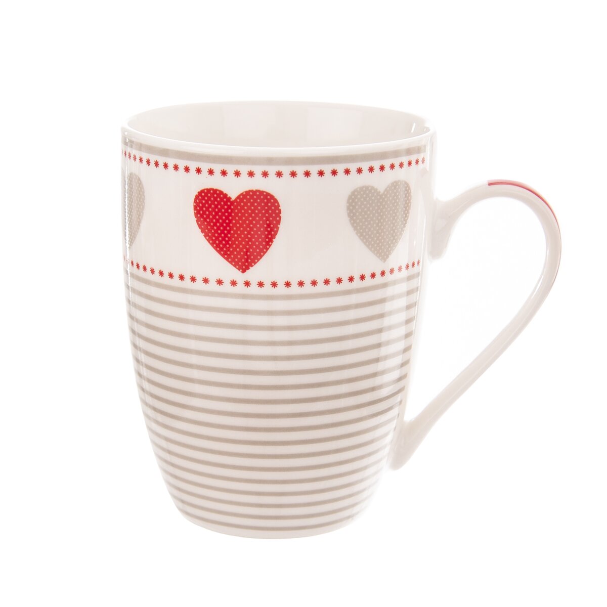 Krásny porcelánový hrnček s objemom 350 ml na horúce aj studené nápoje. Zaujme svojim dekorom prúžkov v dolnej časti šálky a motívmi srdiečka v jeho hornej časti.