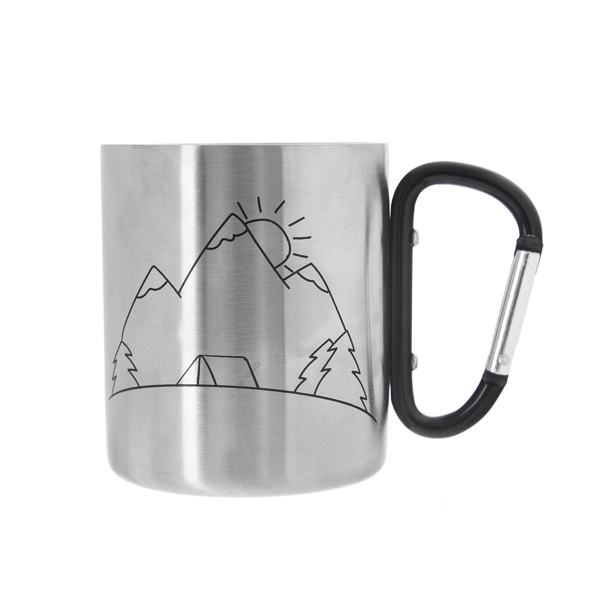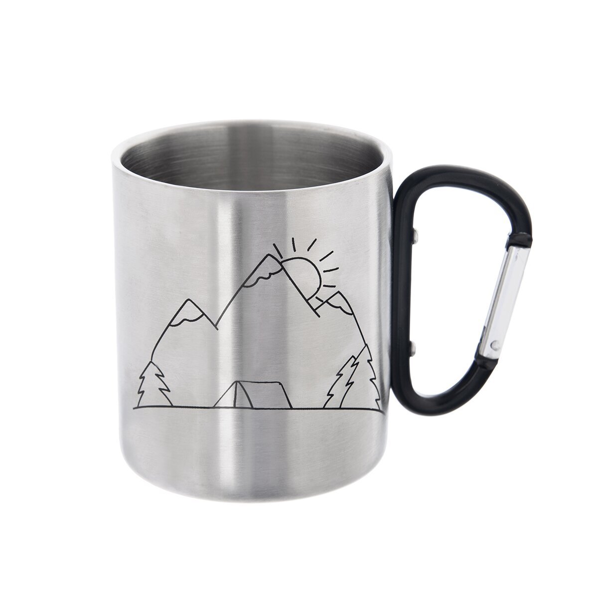 Kód produktu 112440Dvojstenný nerezový hrnček HORY s objemom 0,35 l je určený na výlety, dovolenky, tábory a vďaka štýlovej potlači treba aj na trip do hôr. Ako rukoväť poslúži funkčná karabína, takže ho možno pripevniť na opasok, batoh.