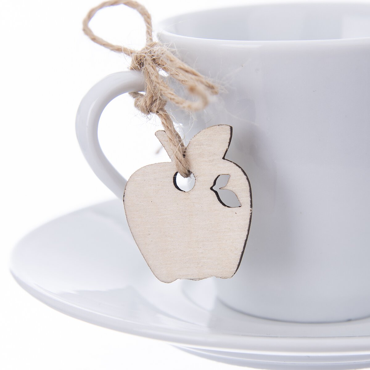 Hrnček s uchom, podšálka a prívesok. Materiál: porcelán, drevo. Farba biela. Rozmery: objem 0,09 l, pr. š. 6 cm, pr. podš. 12 cm, prívesok 2,5x2,5 cm.