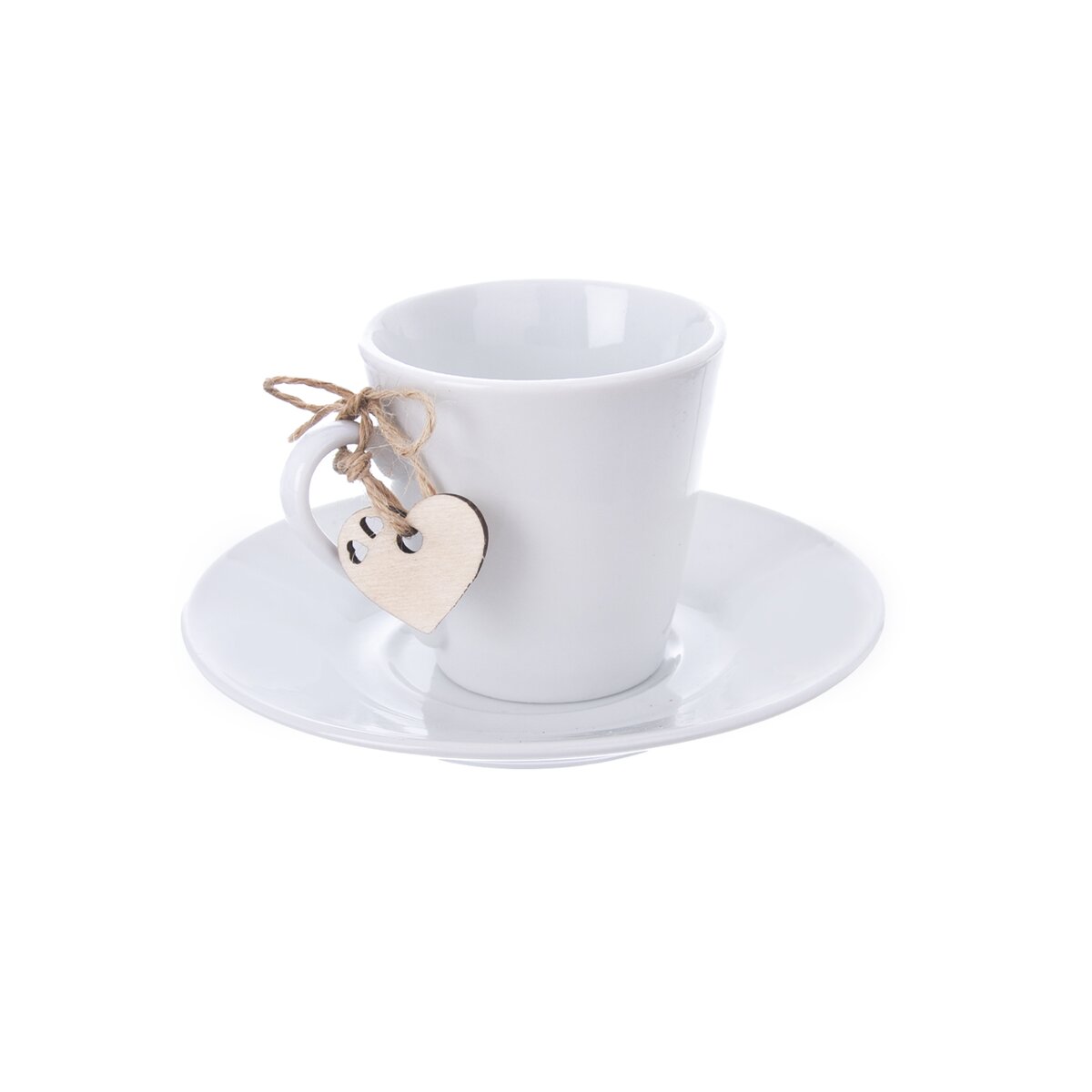 Kód produktu 610828Hrnček s uchom, podšálka a prívesok. Materiál: porcelán, drevo. Farba biela. Rozmery: objem 0,09 l, pr. š. 6 cm, pr. podš. 12 cm, prívesok 2,5x2,5 cm.
