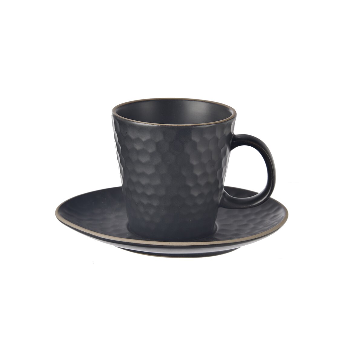 Kód produktu 112436Matný čierny hrnček s objemom 0,1 l má štýlový plastický dekor a svetlú obvodovú linku. Je doplnený tanierikom nepravidelného tvaru a hodí sa na podávanie espressa.