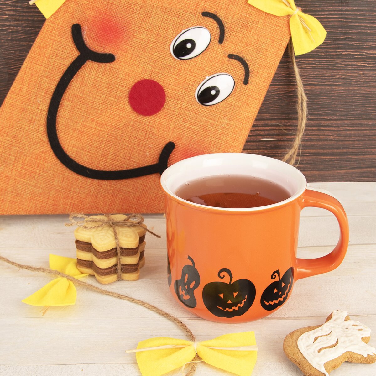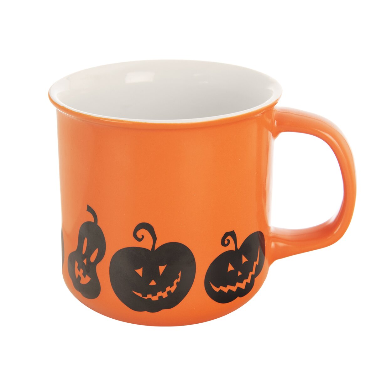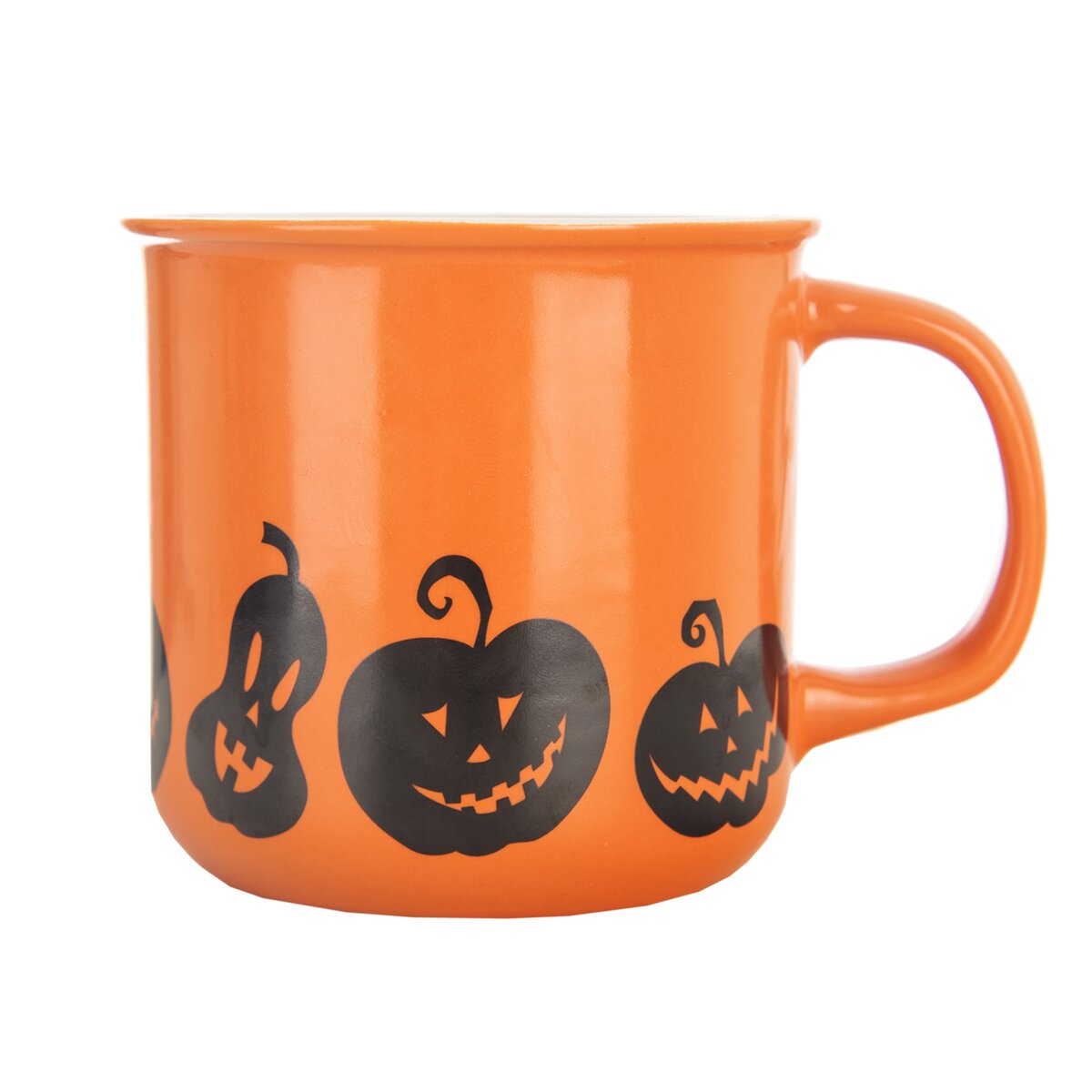Kód produktu 129474Keramický hrnček s objemom 0,46 l, s oranžovou glazúrou a motívom halloweenskych tekvíc, je určený na podávanie čaju, kakaa a iných teplých či studených nápojov.