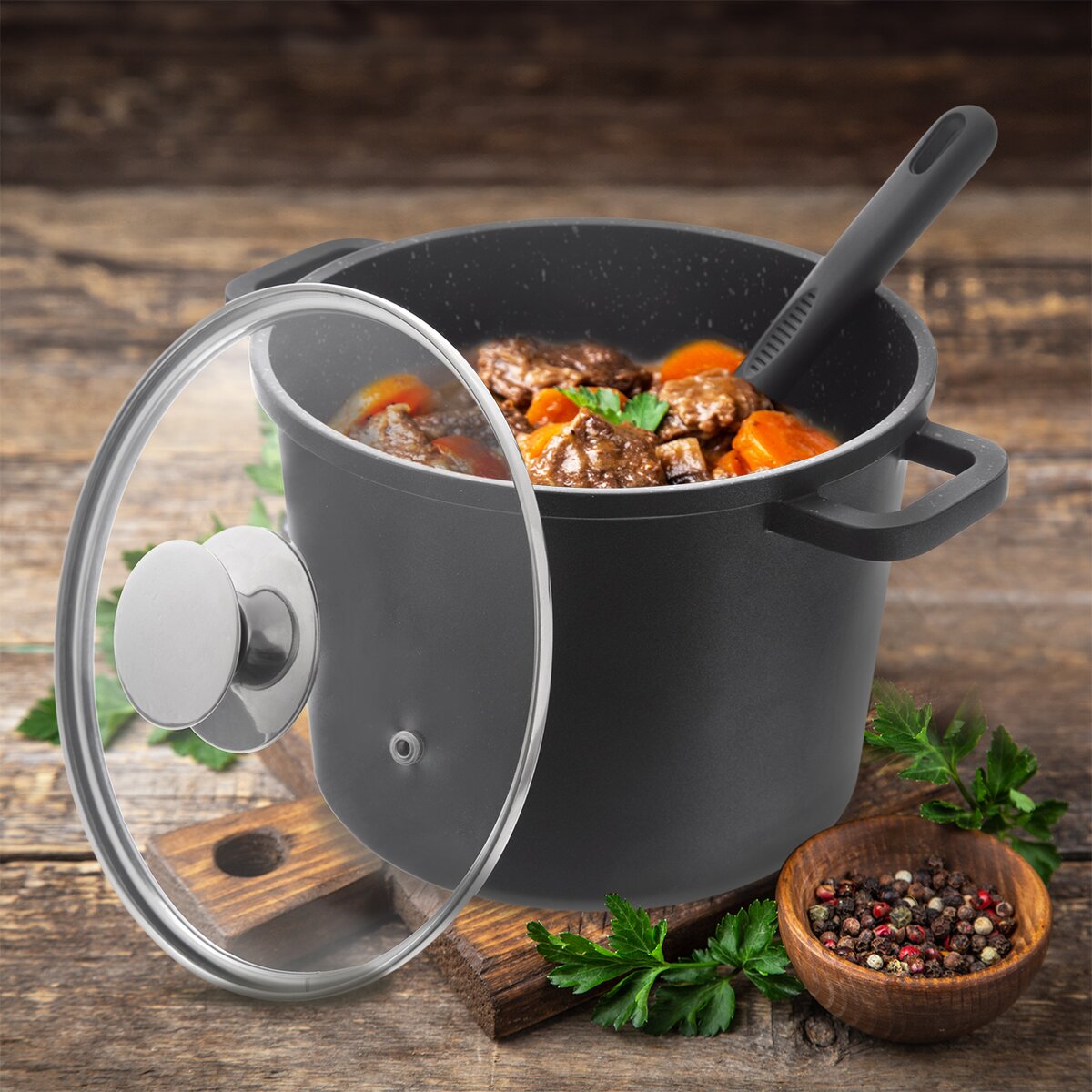 Masívny hrniec je opatrený sklenenou pokrievkou s nerezovým lemom a otvorom na únik prebytočnej pary, budete tak mať prehľad nad stavom pripravovaného pokrmu.