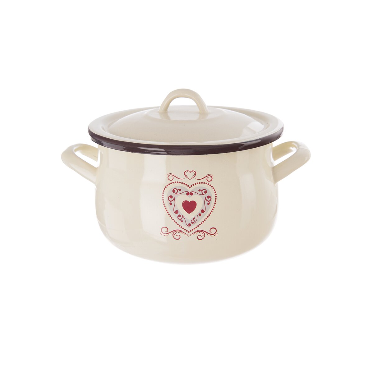 Kód produktu 113086Krásny krémový smaltovaný hrniec s ľudovým dekorom o objeme 2,3 l s pokrievkou na varenie, dusenie aj pečenie vašich obľúbených jedál, je vhodný na všetky typy sporákov aj do rúry.