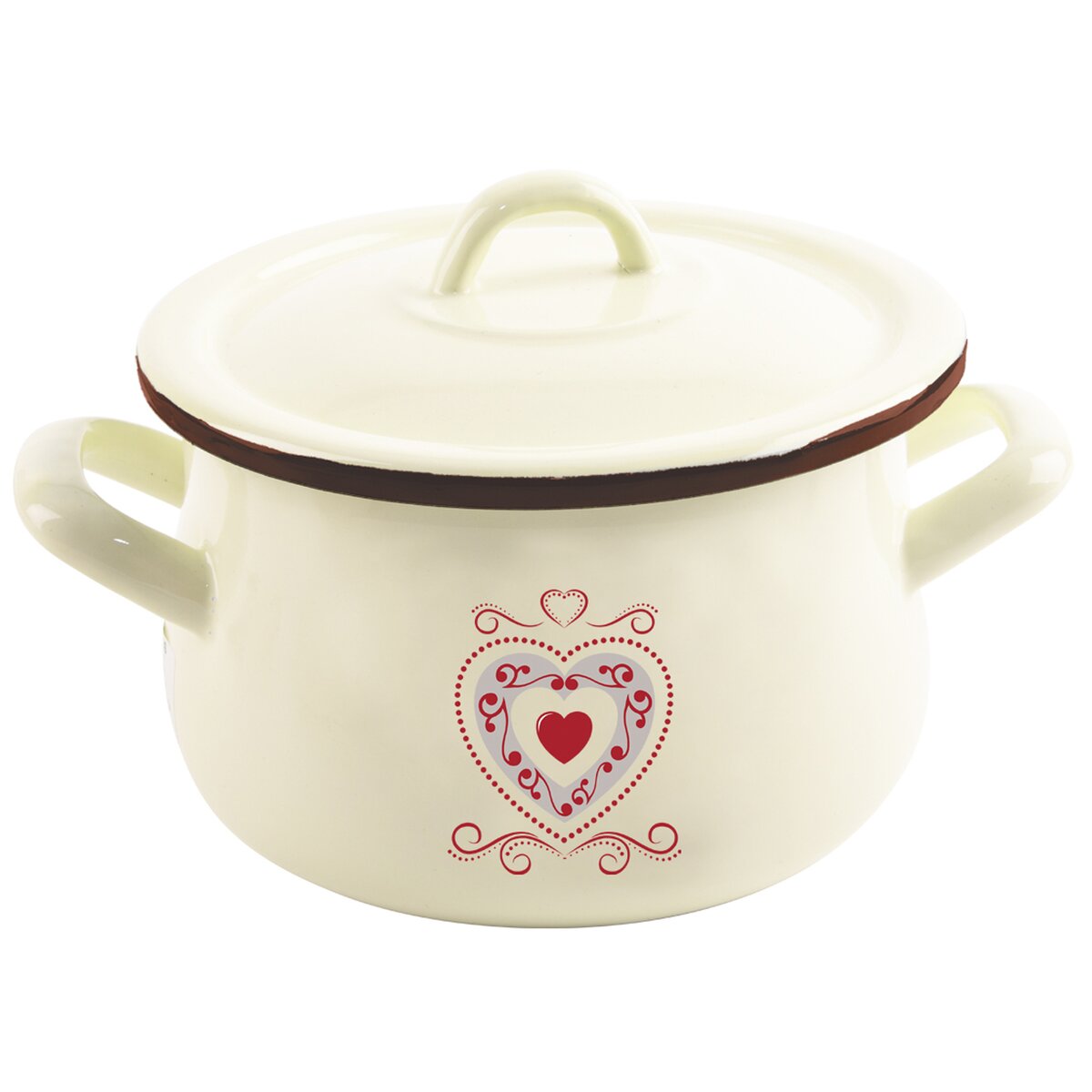 Kód produktu 113088Krásny krémový smaltovaný hrniec s ľudovým dekorom o objeme 4,8 l s pokrievkou na varenie, dusenie aj pečenie vašich obľúbených jedál, je vhodný na všetky typy sporákov aj do rúry.
