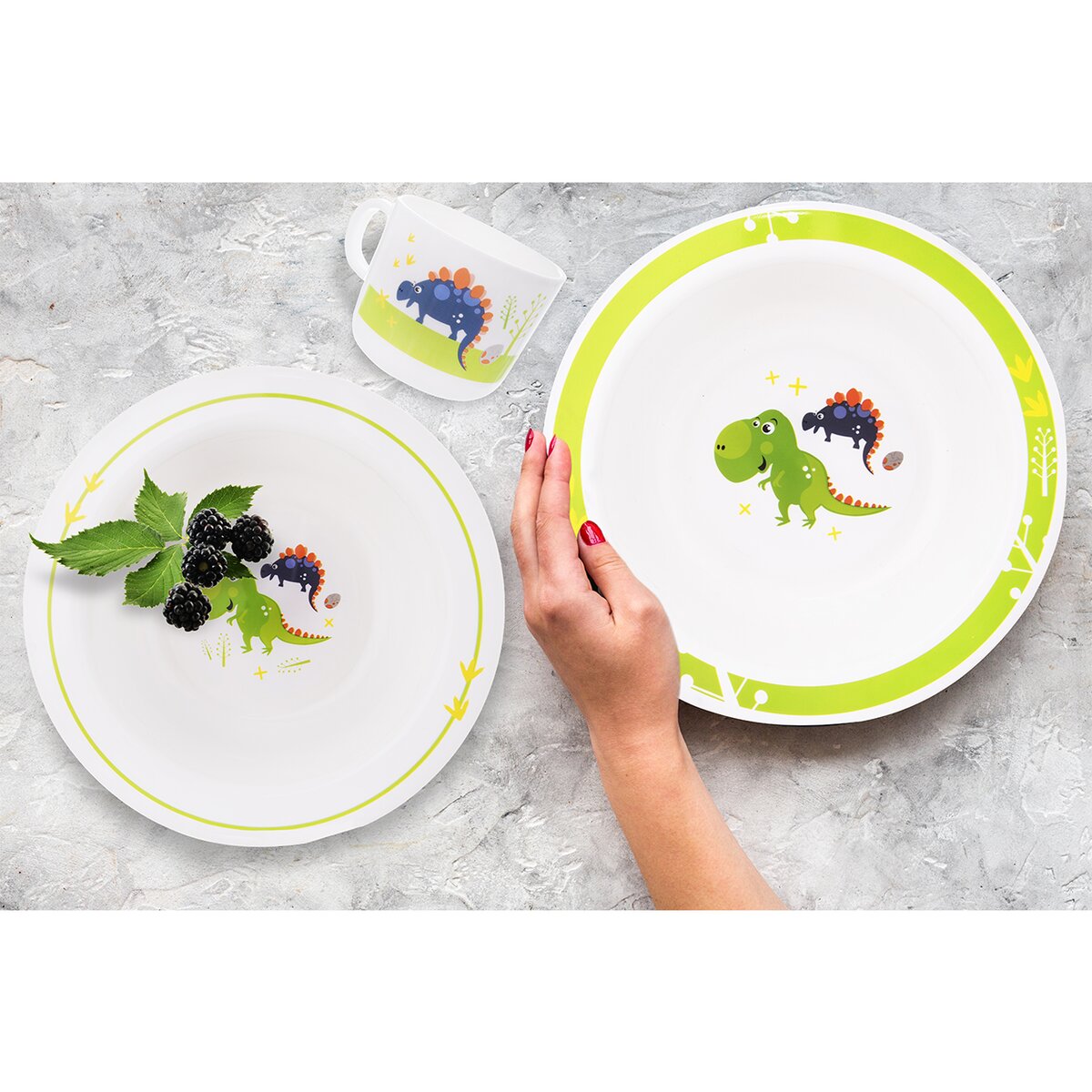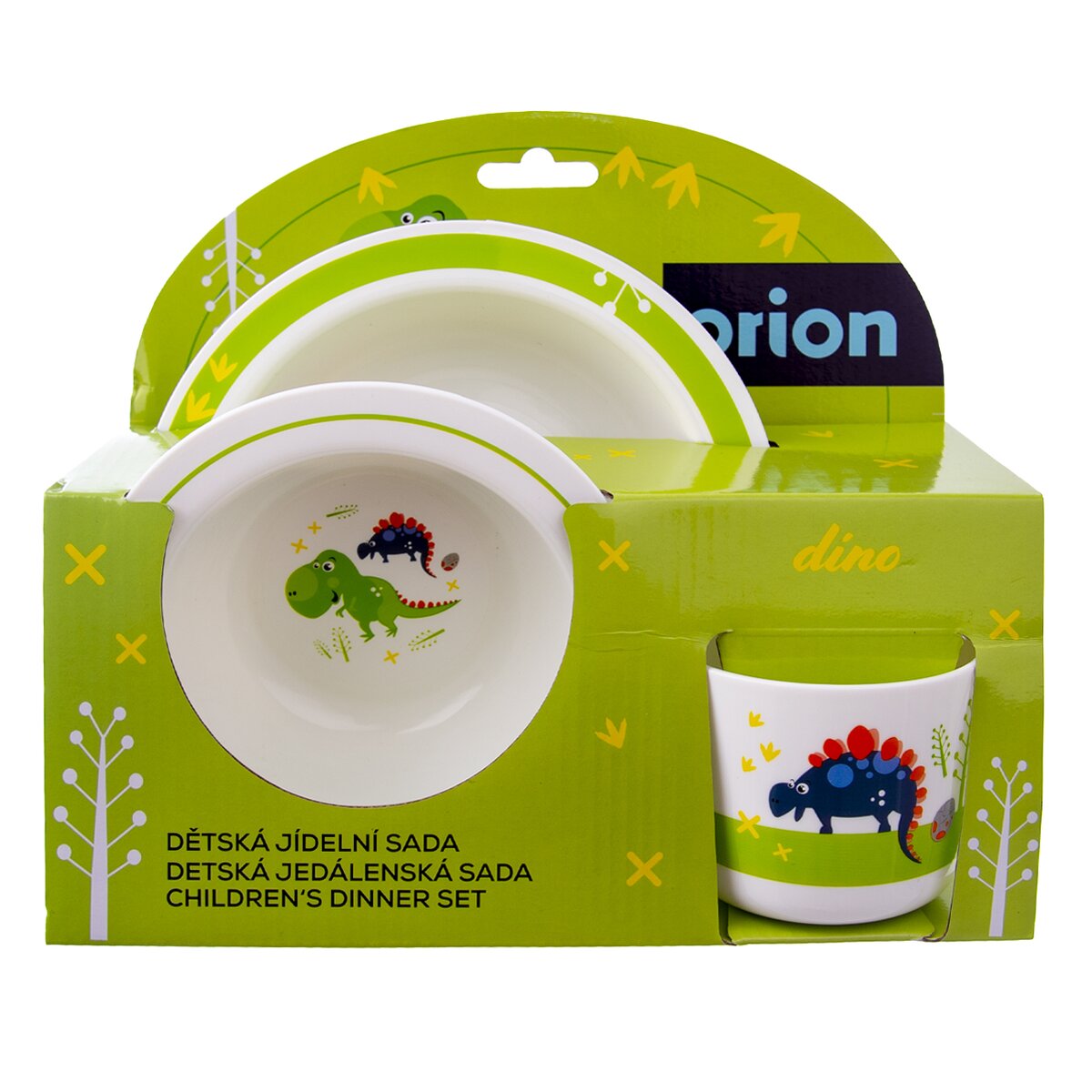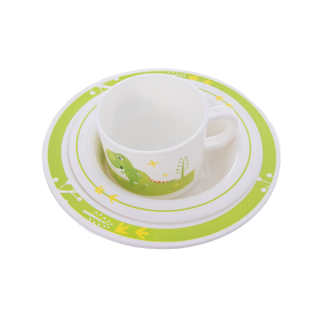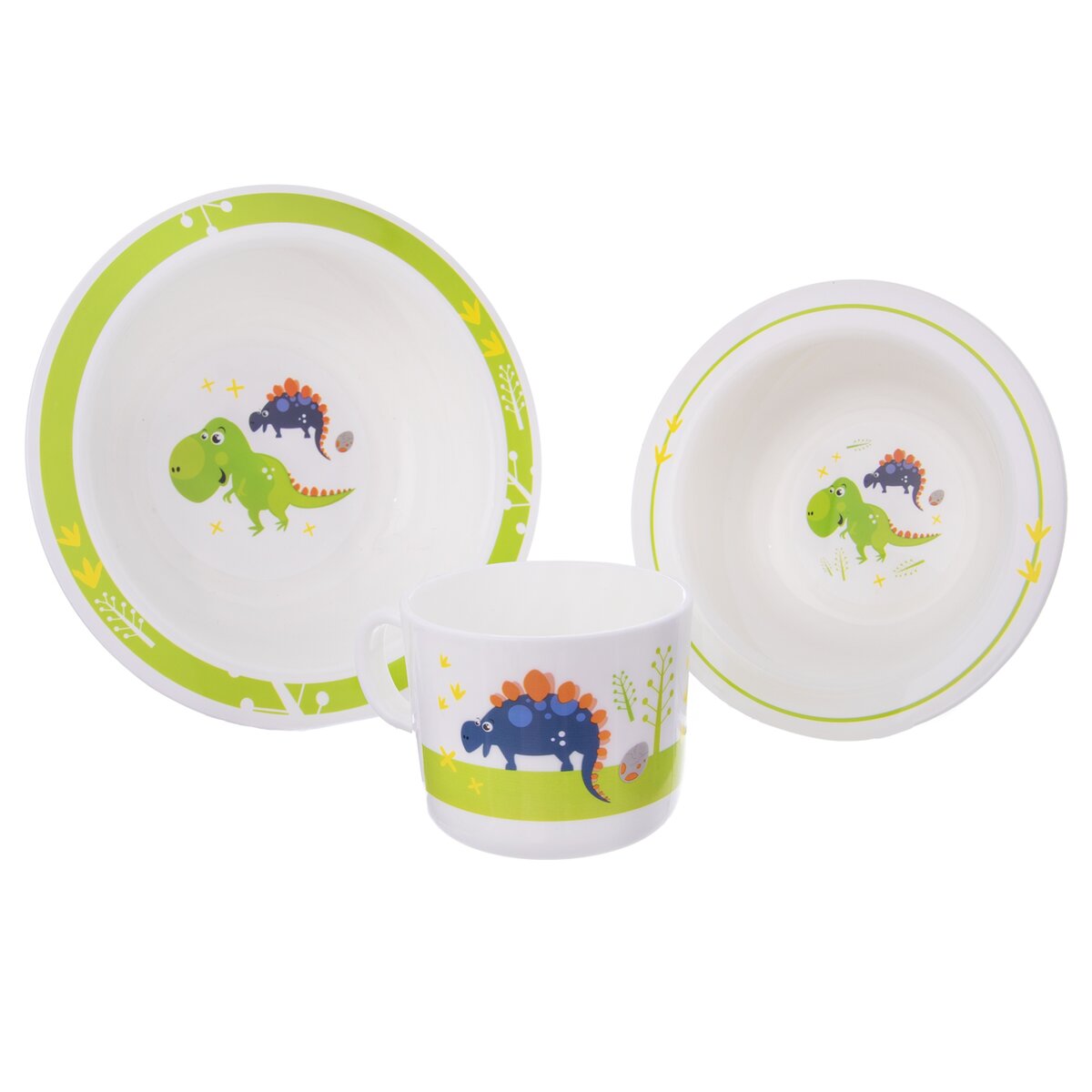 Kód produktu 112349Plastová jedálenská sada DINO tvorená hrnčekom s objemom 0,25 l, tanierom a dvoma hlbokými miskami s priemerom 14 cm a 17,5 cm.