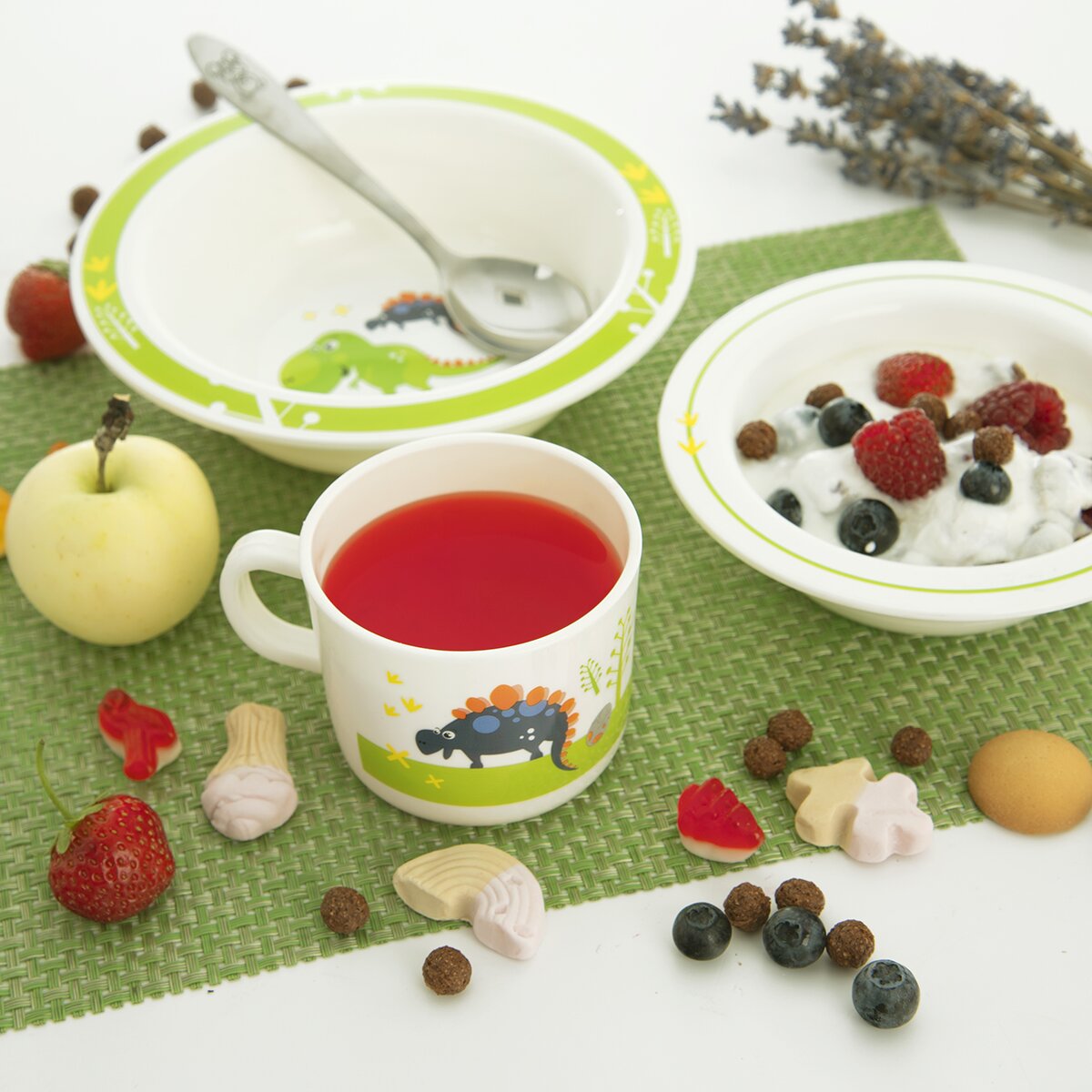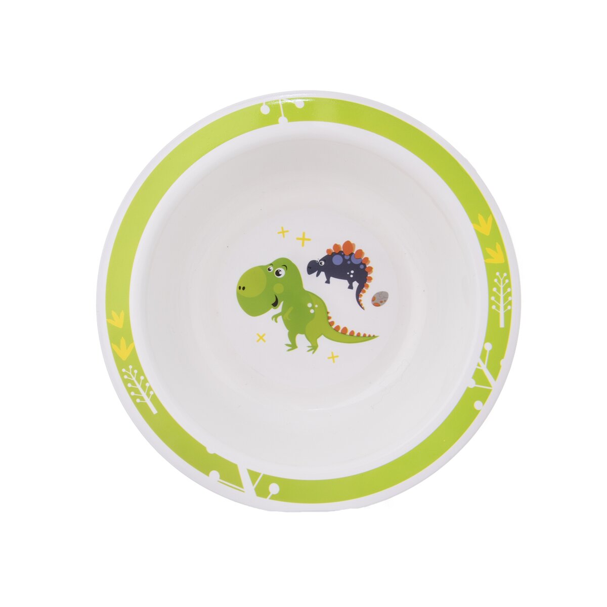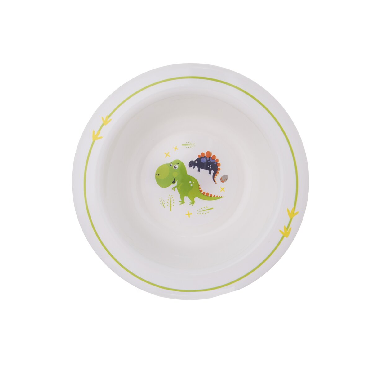 Hlavným motívom je roztomilý obrázok dvoch dinosaurov, okraje misiek sú zvýraznené pruhom. Riad môže do umývačky aj mikrovlnnej rúry.