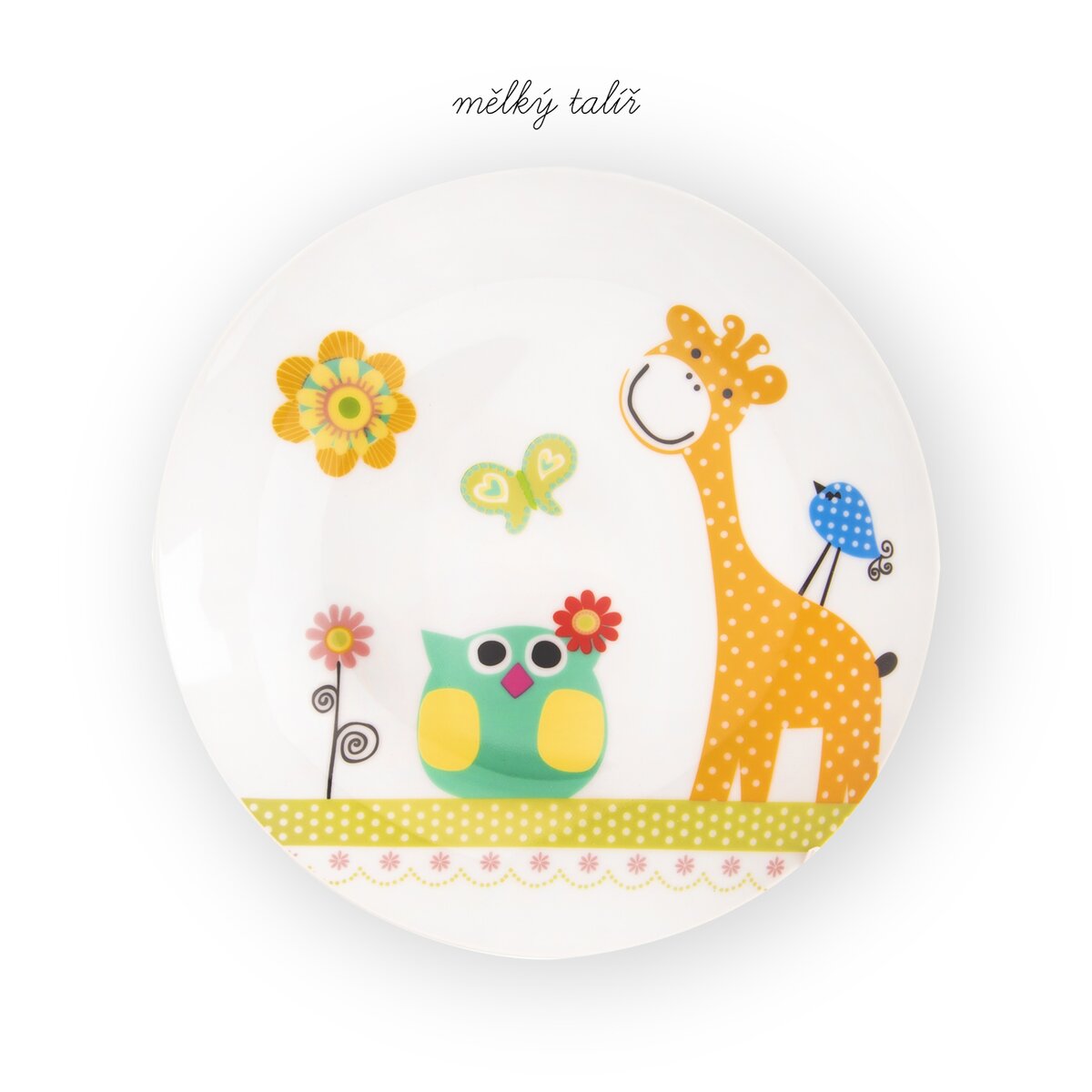 Kód produktu 112340Porcelánová jedálenská sada ŽIRAFA tvorená hrnčekom s objemom 0,225 l, hlbokým tanierom s priemerom 19 cm a plytkým tanierom s priemerom 21 cm.