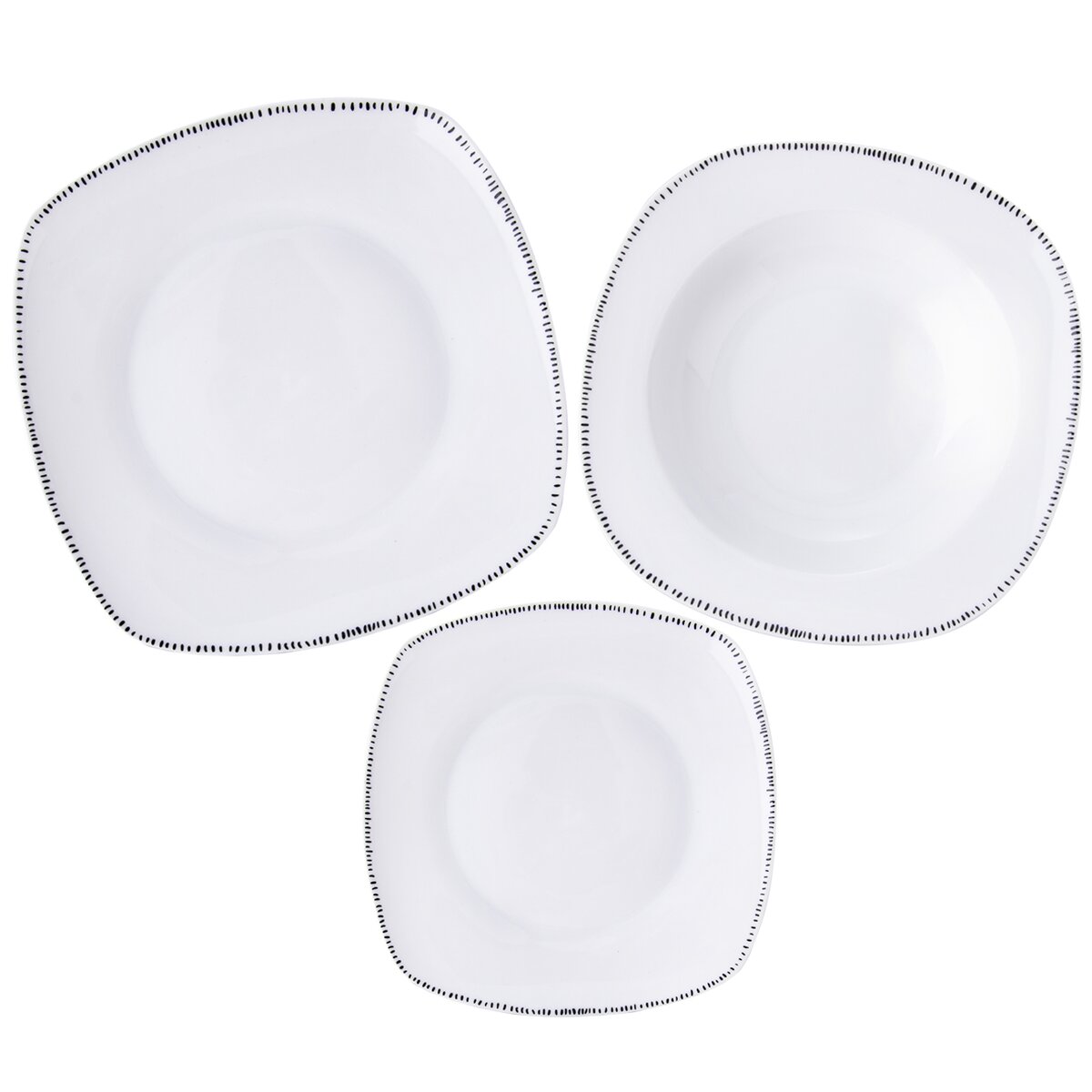 Kód produktu 128457Jedálenská porcelánová sada je tvorená šiestimi hranatými dezertnými, šiestimi hlbokými a šiestimi plytkými taniermi s jemným dekorom čiarok po obvode.