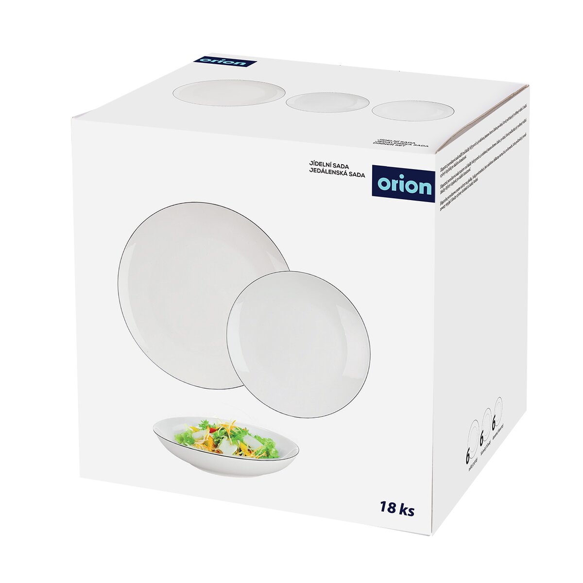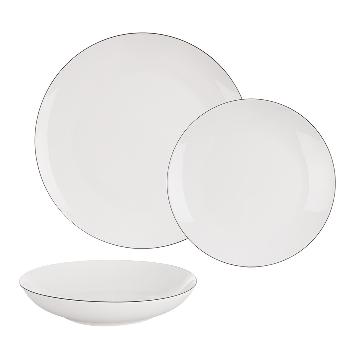 Kód produktu 129599Jedálenská sada DECORA z bieleho porcelánu zdobeného tenkou čiernou linkou po obvode obsahuje 6 dezertných, 6 hlbokých a 6 plytkých tanierov. Hodí sa na každodenné aj sviatočné stolovanie.