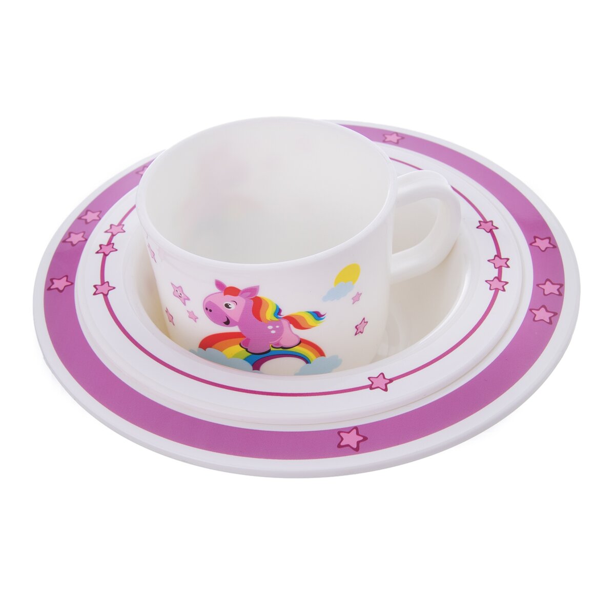 Kód produktu 112348Plastová jedálenská sada KONÍK tvorená hrnčekom s objemom 0,25 l a dvoma hlbokými miskami s priemerom 14 cm a 17,5 cm.