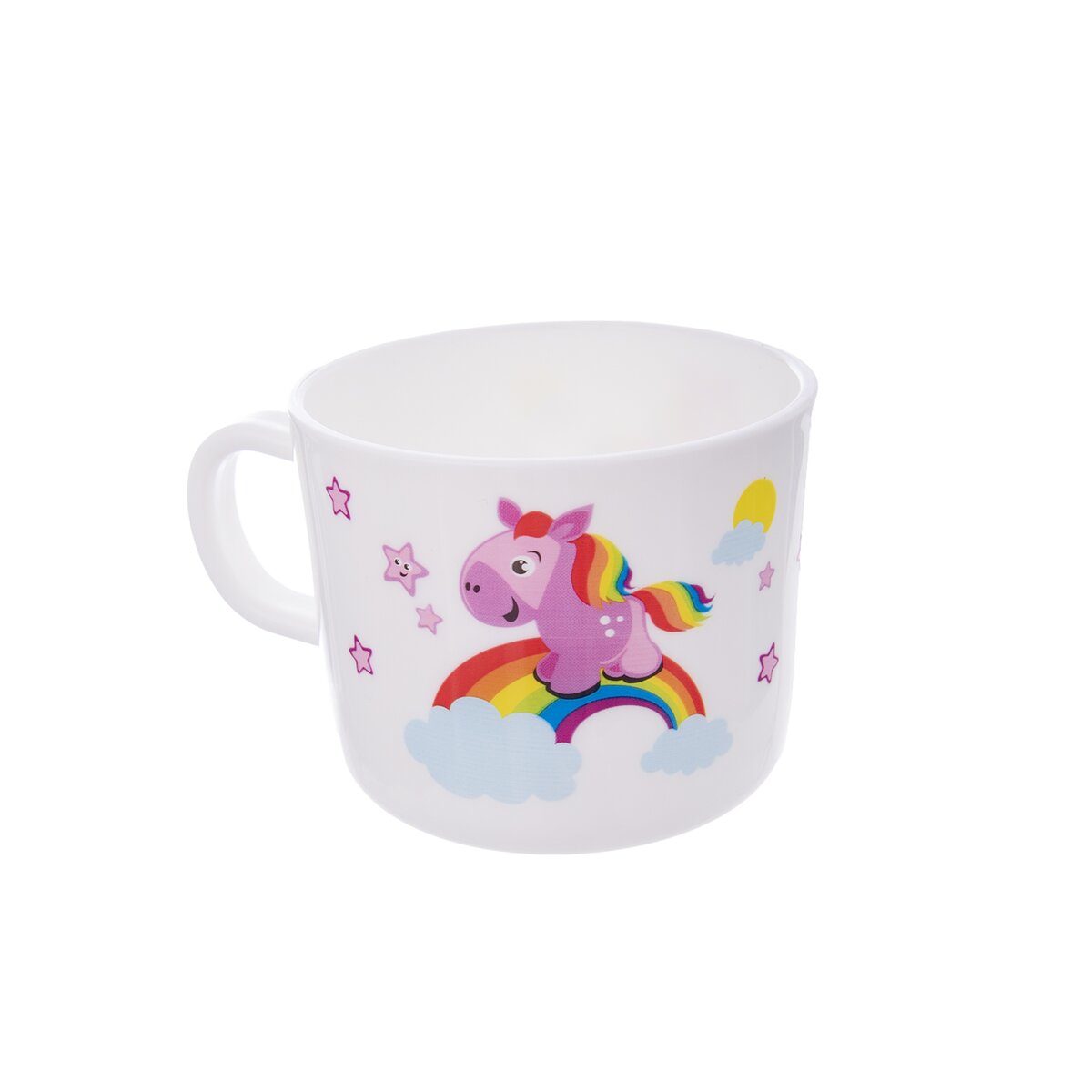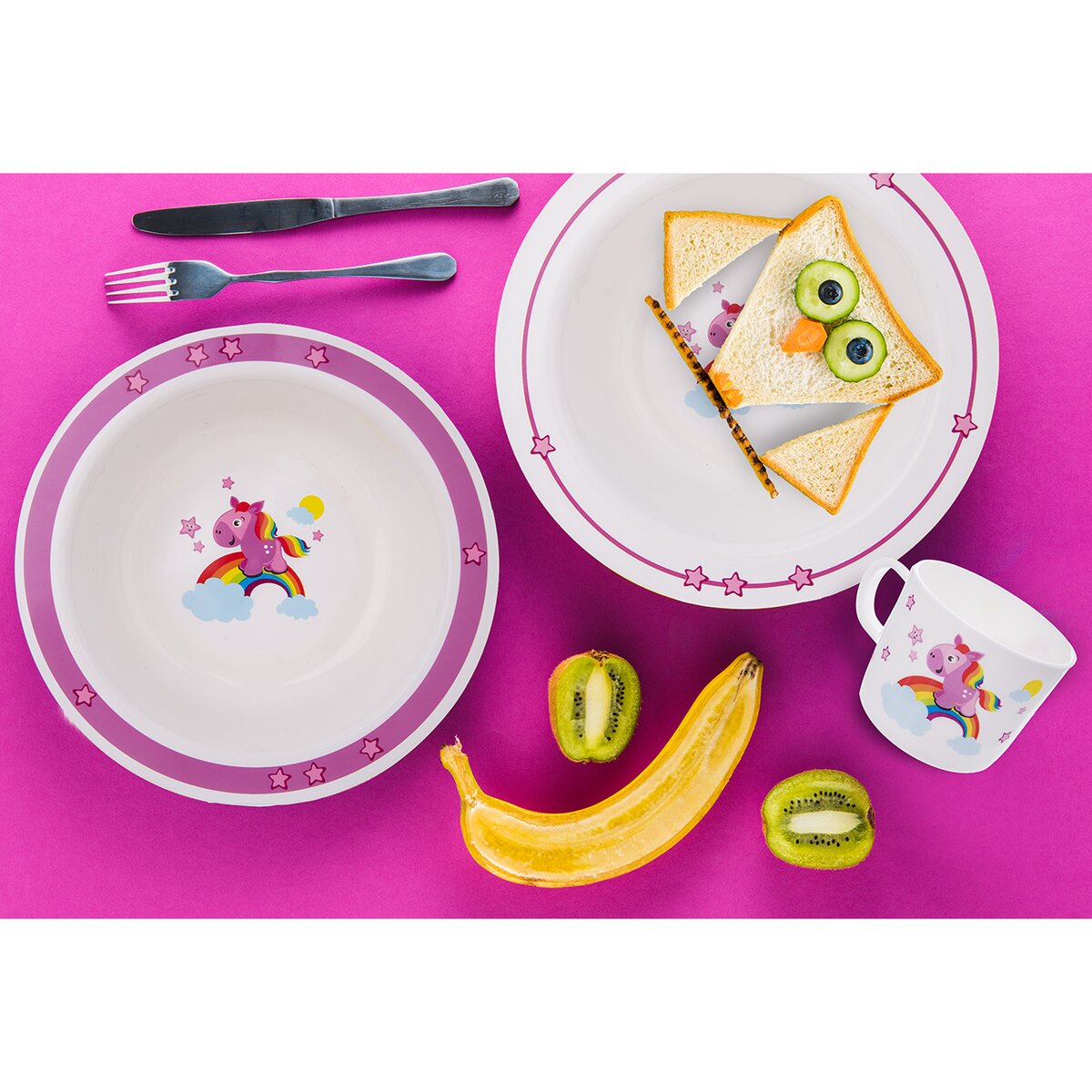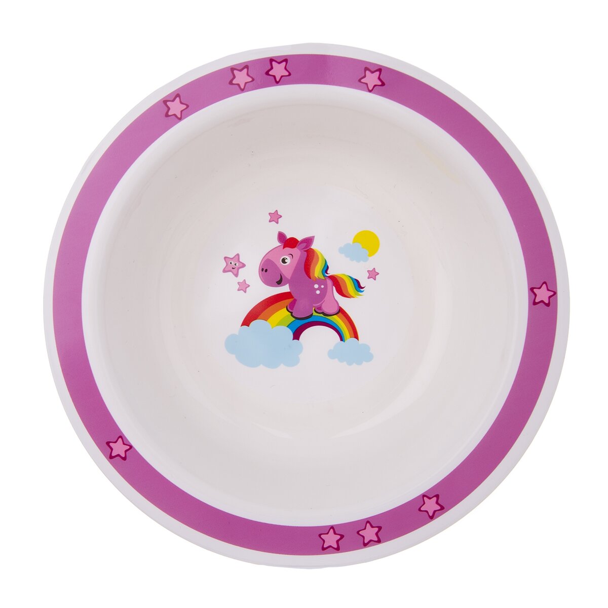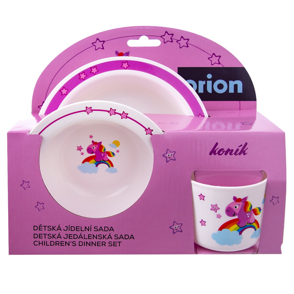 Ružový koník preháňajúci sa po nebesiach. Prečo stojí na dúhe? A kam asi uteká? Táto nebeská jedálenská sada zaujme pozornosť nejedného malého stravníka.