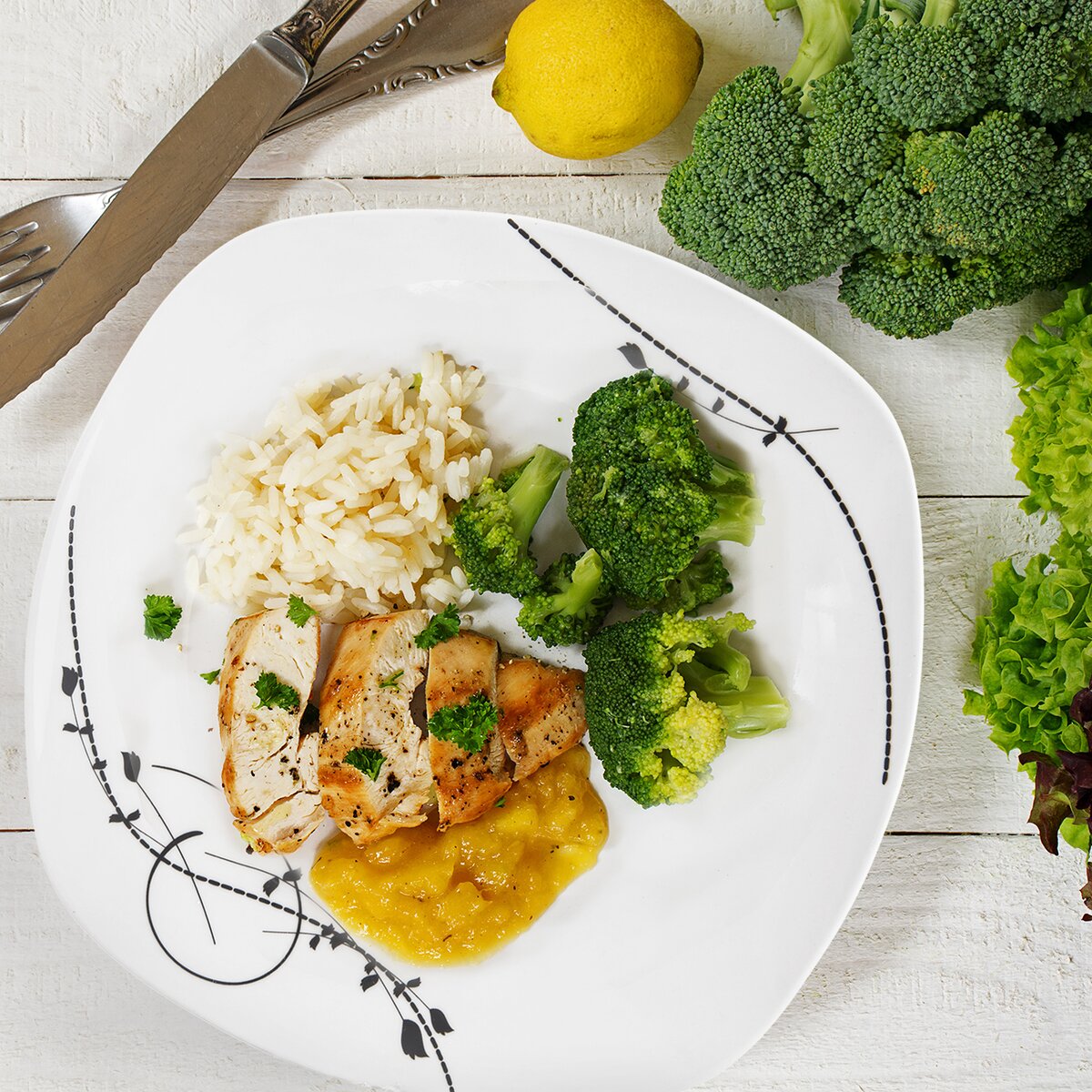 Kód produktu 112355Jedálenská porcelánová sada sa skladá zo 6 hranatých dezertných, 6 plytkých a 6 hlbokých tanierov s jemným čiernym rastlinným dekorom.