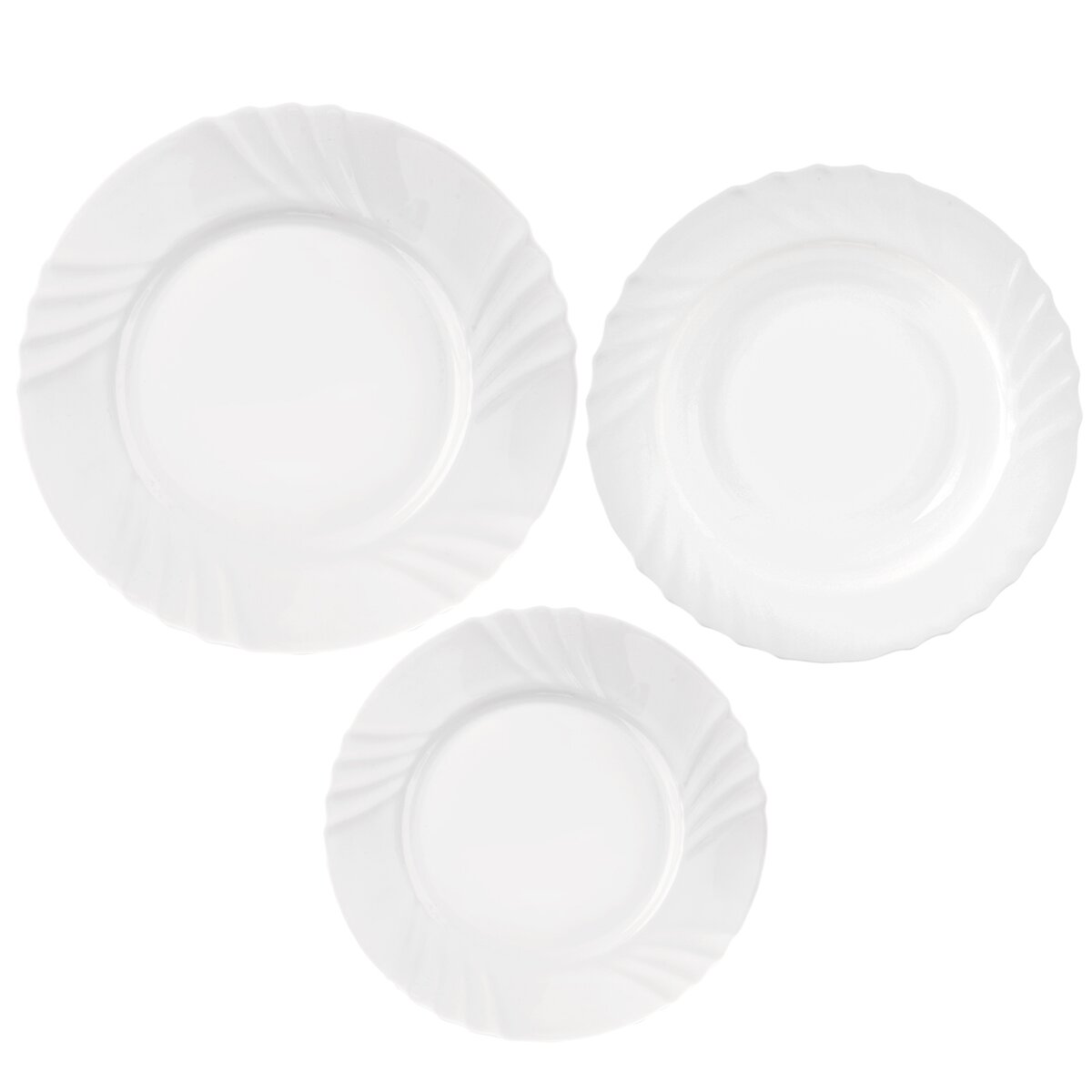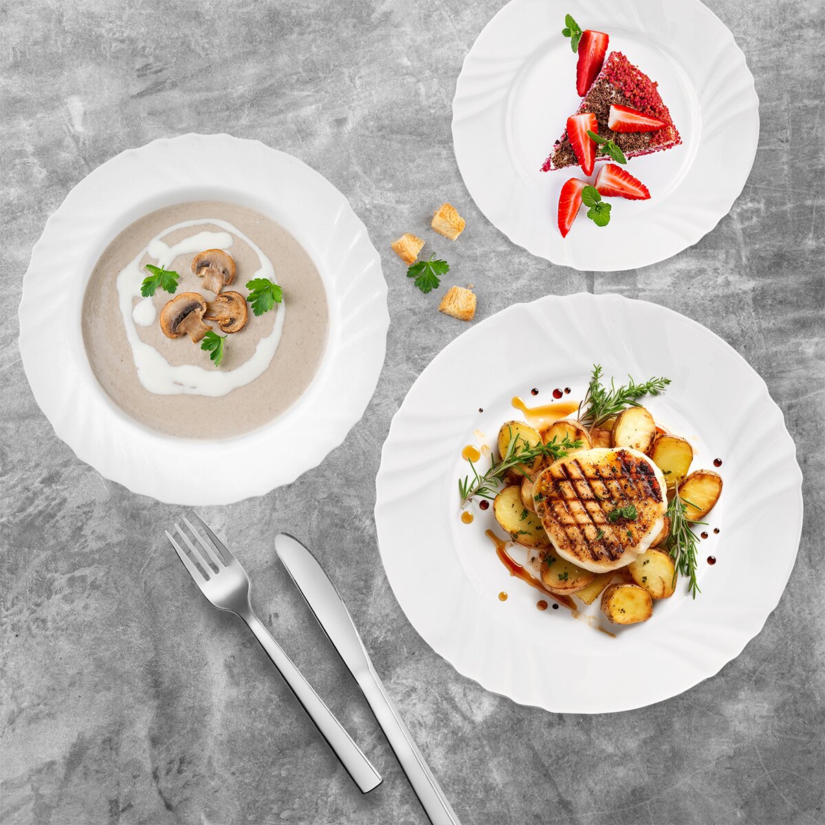 Kód produktu 129575Jedálenská sada LUNA VLNKY z bieleho opálového skla s plastickým zdobením po okraji obsahuje 6 dezertných, 6 hlbokých a 6 plytkých tanierov. Hodí sa na každodenné aj slávnostné stolovanie.
