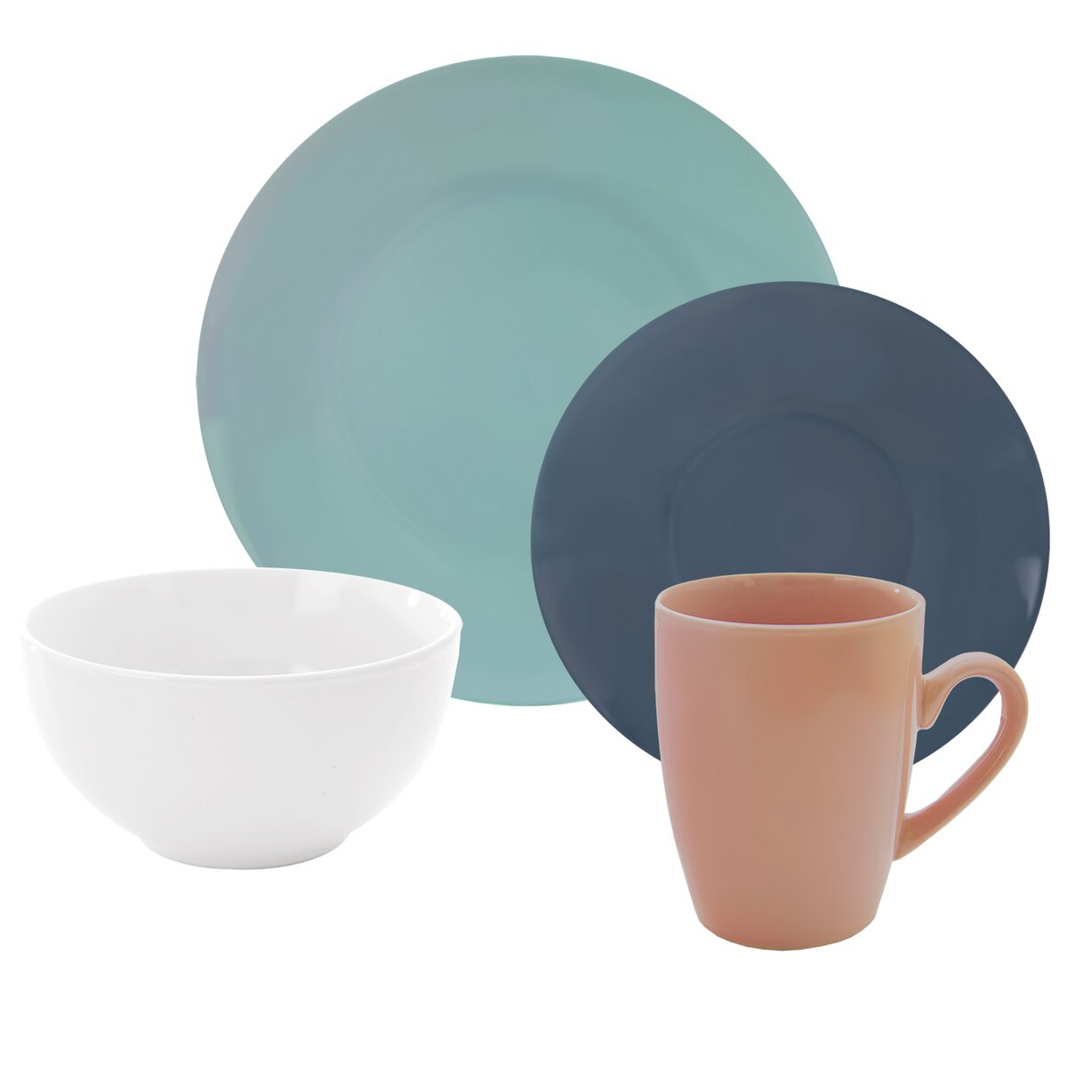 Kód produktu 129541Jedálenská farebná sada obsahuje 16 dielov – 4x tanier plytký, 4x tanier dezertný, 4x misku a 4x hrnček. Okrúhly tvar, 4 farby. Materiál: kamenina. Rozmery: plytký pr. 27 cm, dezertný pr. 21 cm, miska pr. 14 cm, v. 7,5 cm, o. 750 ml, hrnček pr. 9 cm, v. 11 cm, o. 420 ml. Taniere môžete umývať v umývačke, možno ich použiť v MVR.