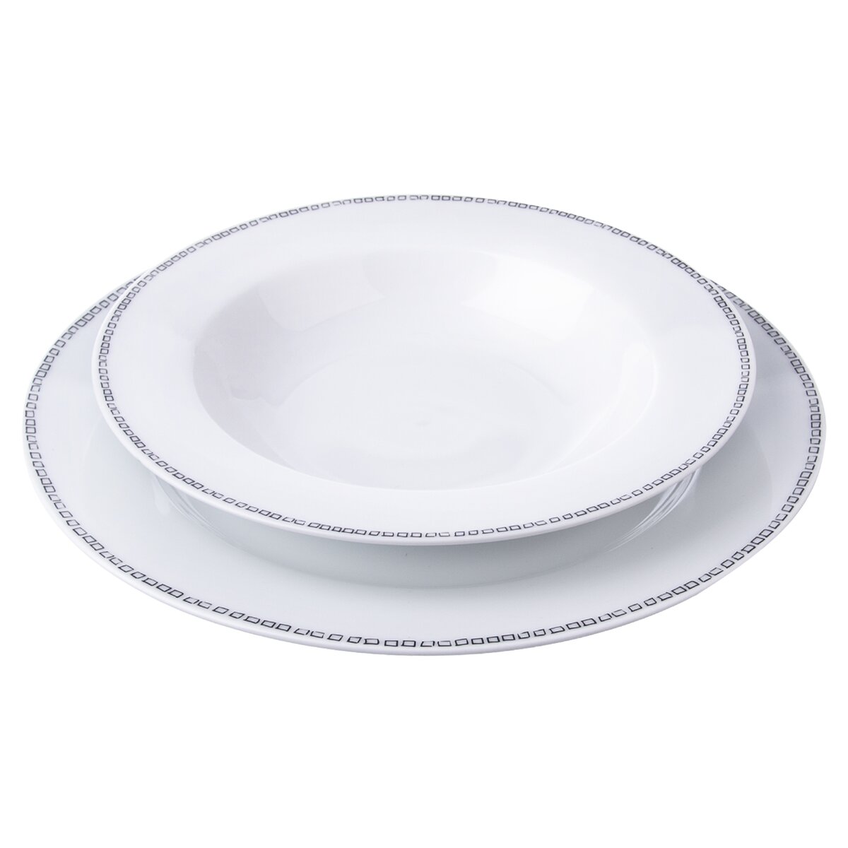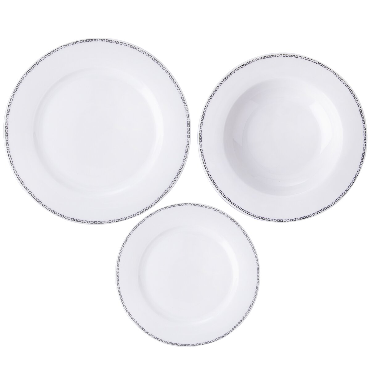 Kód produktu 128455Jedálenská porcelánová sada je tvorená šiestimi dezertnými, šiestimi hlbokými a šiestimi plytkými taniermi s jemným dekorom štvorčekov po obvode.