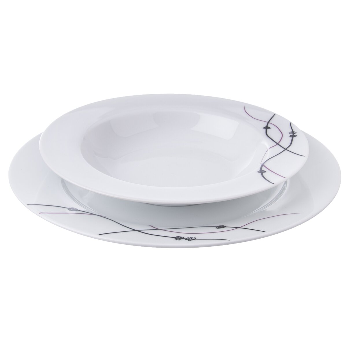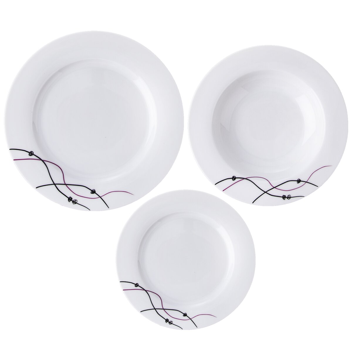 Kód produktu 128454Jedálenská porcelánová sada je tvorená šiestimi dezertnými, šiestimi hlbokými a šiestimi plytkými taniermi s jemným dekorom vlniek.