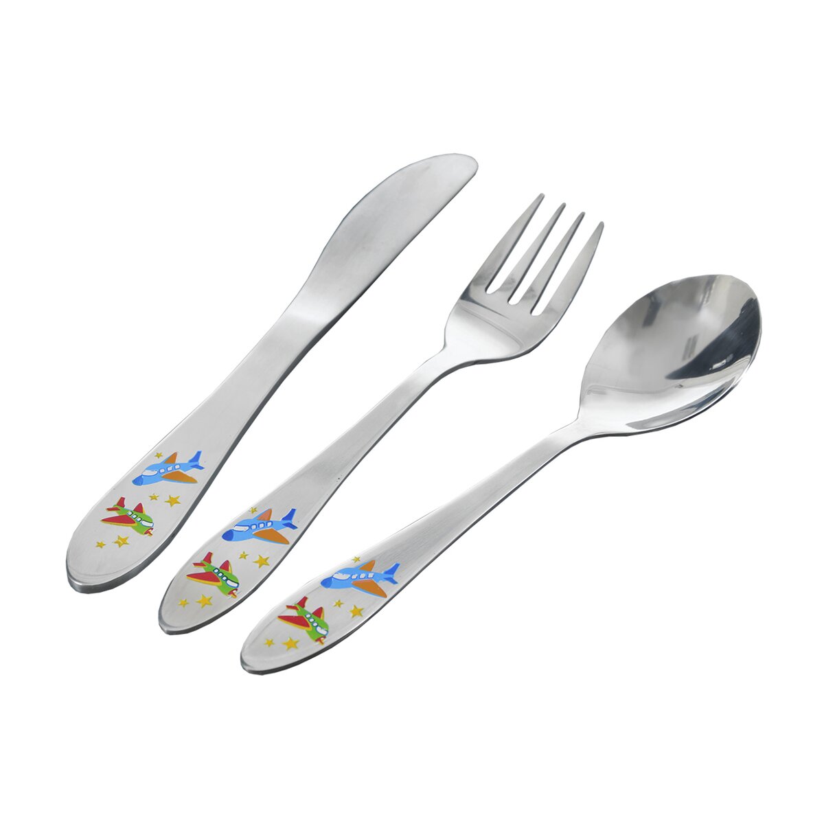 Kód produktu 143617Set detských nerezových príborov s farebným motívom lietadiel obsahuje lyžicu, vidličku a nôž a je určený pre každodenné používanie.